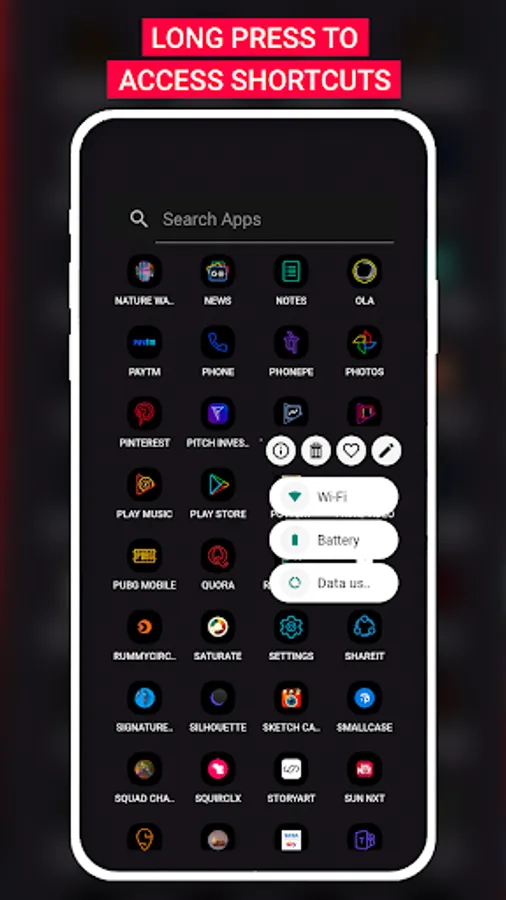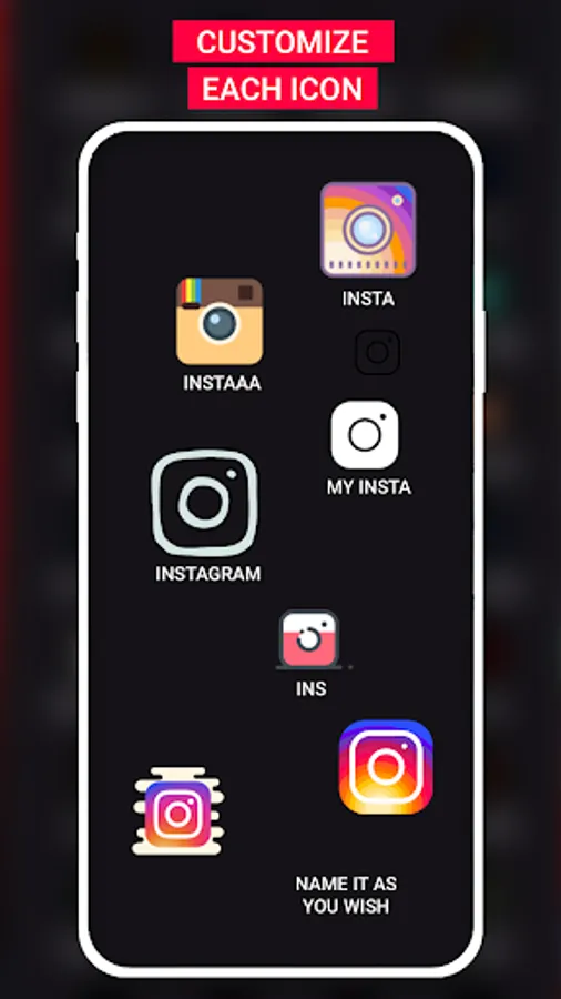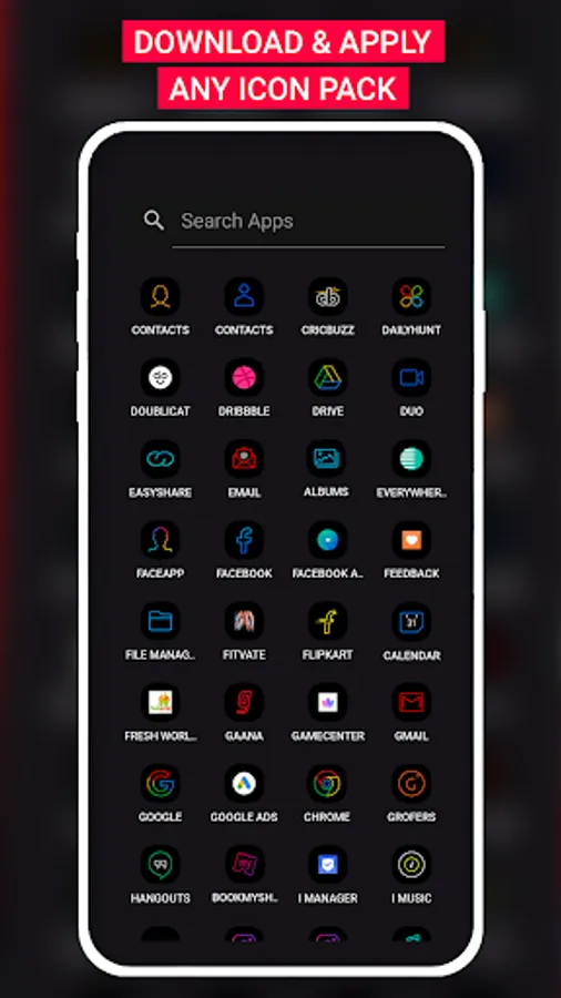 Download and apply any icon pack from the play store. The app background, text and the icon can be completely customized.