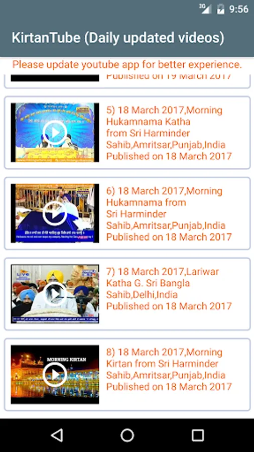 Stay connected with kirtantube app. This app contains videos of Holy Hymns (kirtan) from various hajoori raagis of Harmandir Sahib as well as from other Gurduwaras too.