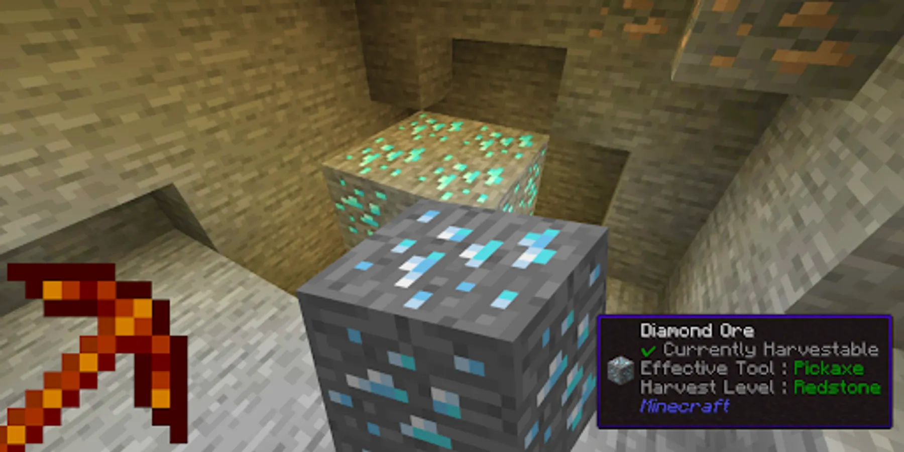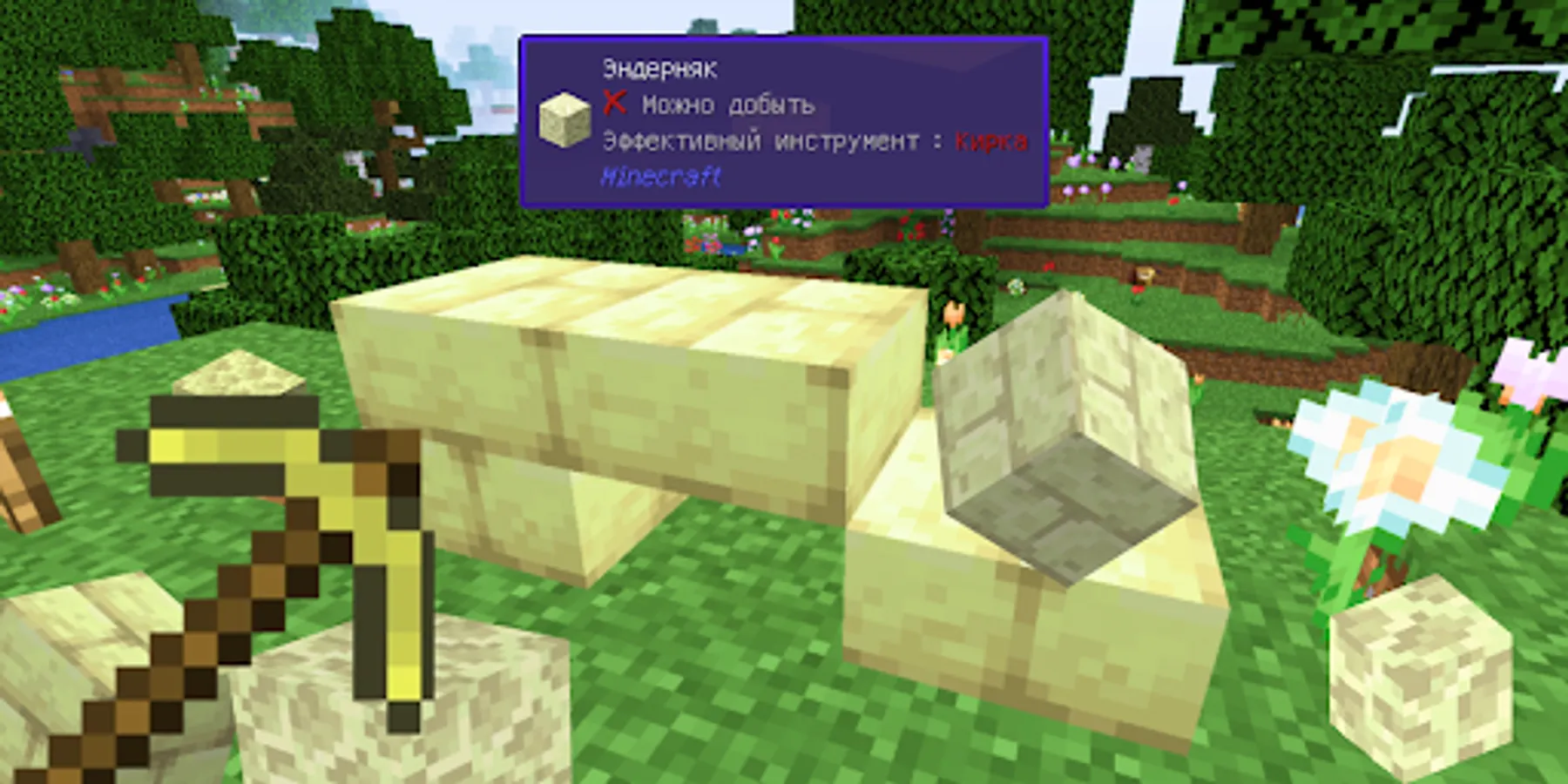 Pop-up icons will tell you the name of the block, the material from which it is made, as well as which tools are best for breaking it! You can also watch information about mobs! For example, you can find out the health status of animals and their names!