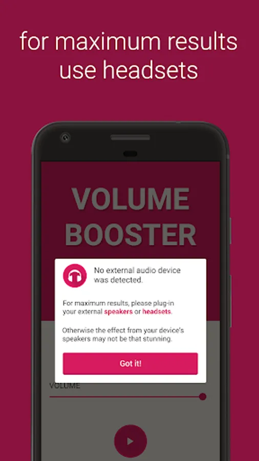 Every device has a built-in Android eQualizer. Volume Booster Pro simply adjusts the frequencies to achieve louder effect. We use the loudness module which runs on devices with Android 4.4, you simply need to tap the Boost button.