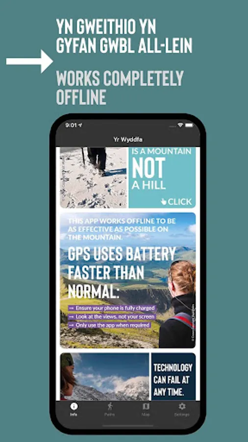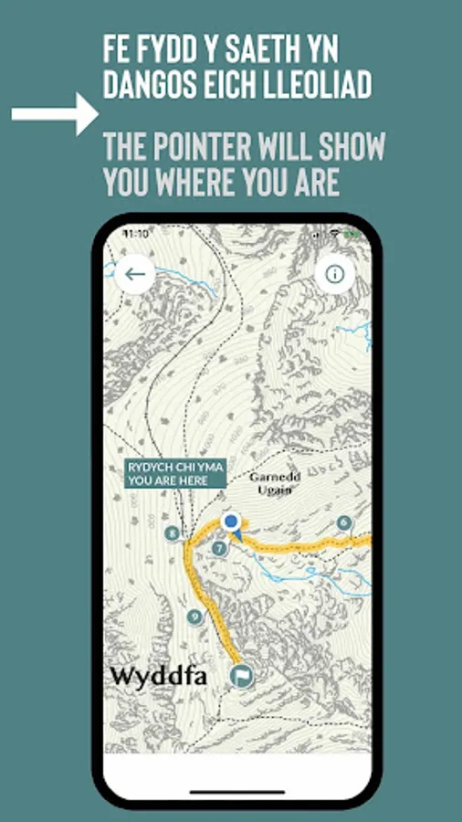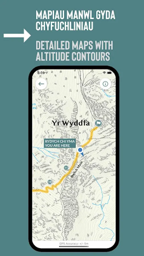Mae’r ap yn hawdd i’w ddefnyddio, yn gweithio gyda GPS ac yn cynnwys mapiau manwl sy’n dilyn eich taith wrth i chi gerdded ar unrhyw un o’r 6 prif lwybr i’r copa. Mae hyn yn gweithio all-lein, sy’n golygu nad oes angen cyflenwad i’r we neu signal ffôn tra’n ei ddefnyddio ar y mynydd. Mae pob map yn cynnwys cyfuchliniau fel y gallwch gadw golwg ar ddarnau anodd wrth i chi gerdded.
