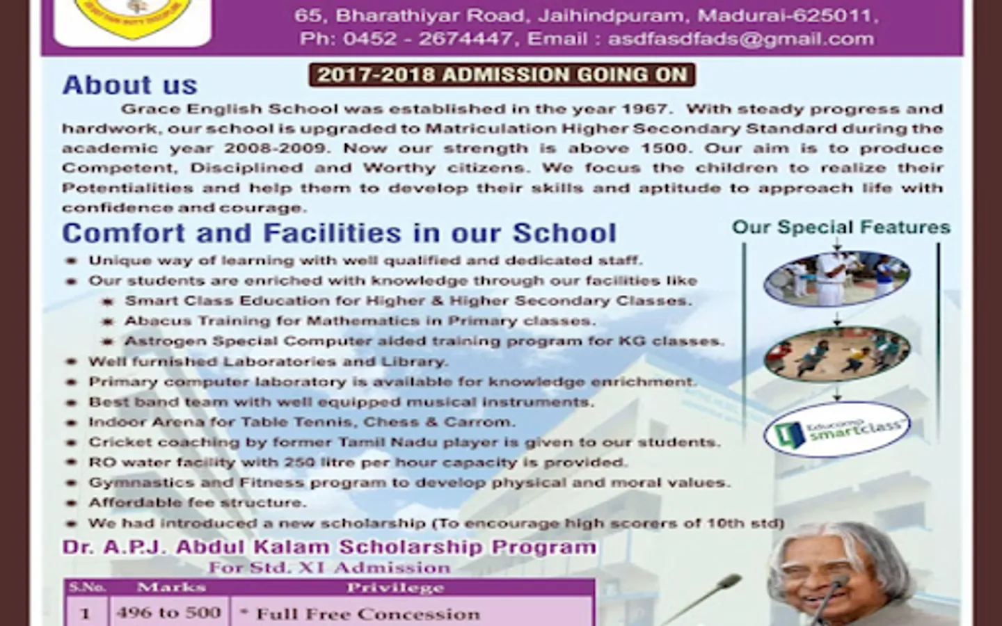 Grace English School was established in the year 1967. With steady progress and hard work, our school is upgraded to Matriculation Higher Secondary Standard during the academic year 2008-2009. Now our strength is above 1500. Our aim is to produce Competent, Disciplined and Worthy Citizens. We focus the children to realize their Potentialities and help them to develop their skills and aptitude to approach life with confidence and courage.