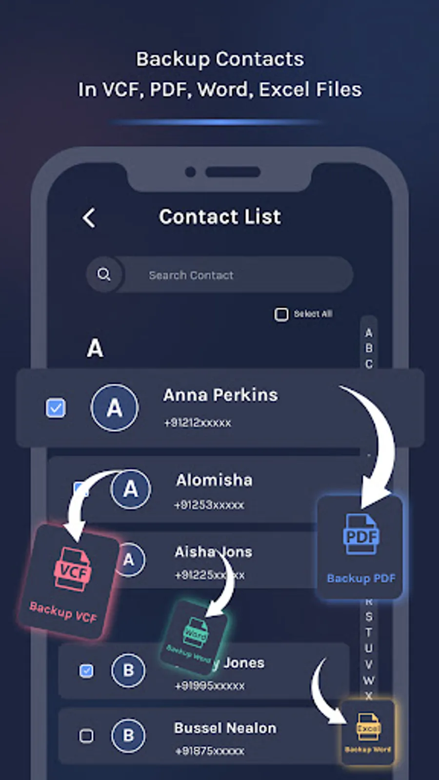 Backup contacts from the phone number list in different formats as pdf, vcf, exel and word formats.