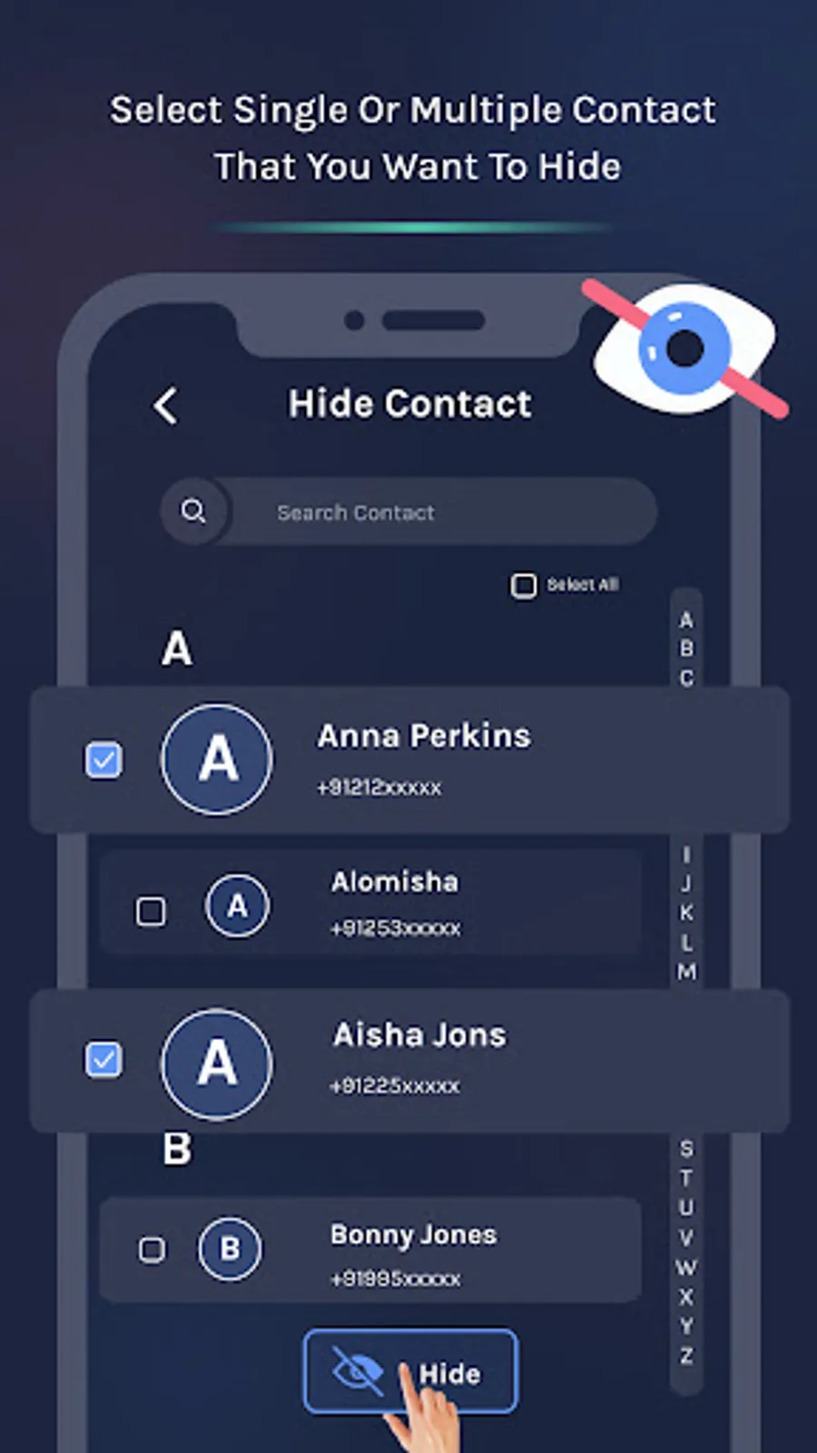 - Single and multiple contacts selection for hide and unhide.