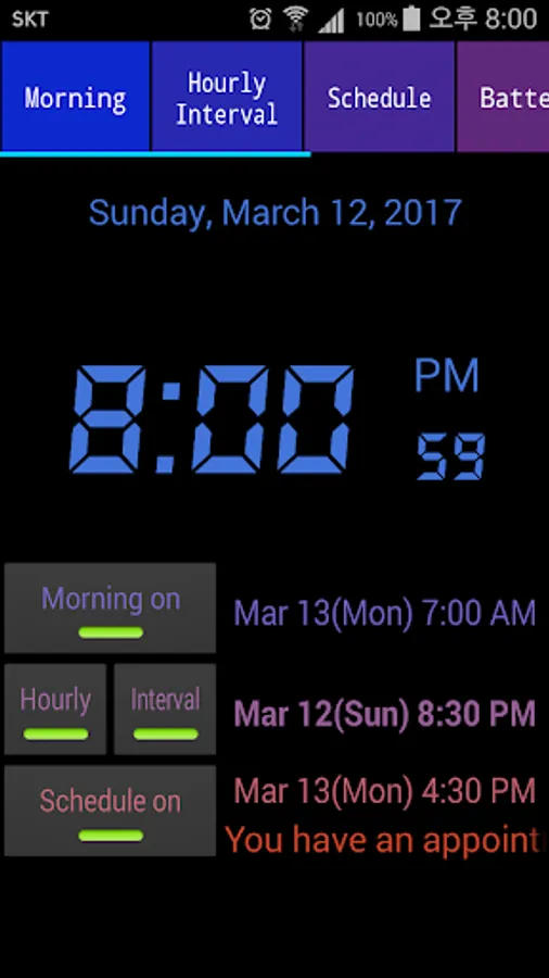 ☆ If your device needs to be charged, the clock will tell you that battery is needed charging. The level of low battery can be changed as you want.