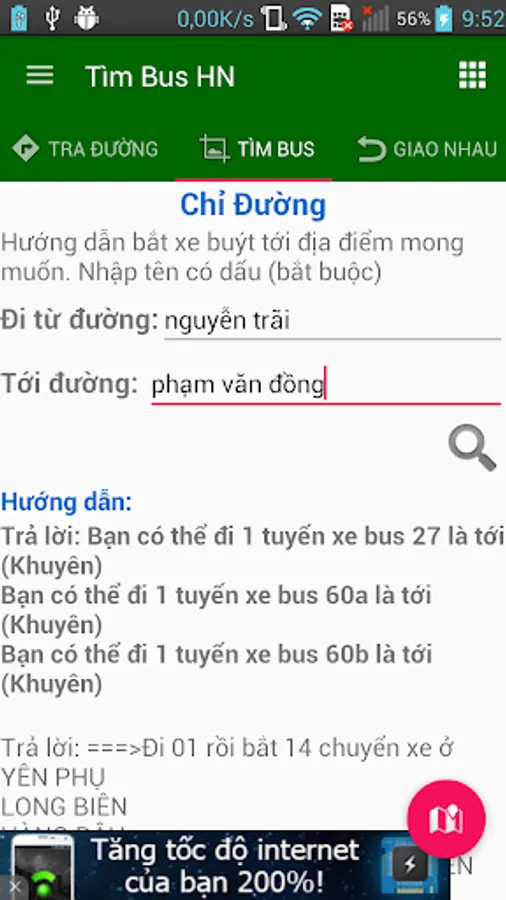Hanoi bus application is an application for android smartphones. With navigation features, search and bus directions for everyone. Providing information about the bus and the bus snowy road crossing in the province Hanoi, I hope that this app please you. I also was student learning is essential, what applications have yet professional desire for sympathy offline.