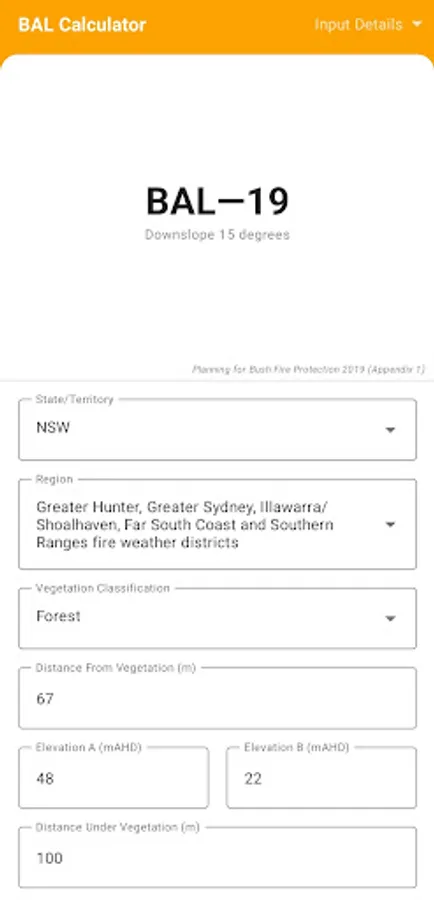 BAL Calculator is an easy to use Bushfire Attack Level (BAL) calculator that has been designed to calculate the BAL using AS 3959:2018 (Method 1 - Simplified Procedure) or Planning for Bush Fire Protection 2019 (Appendix 1).