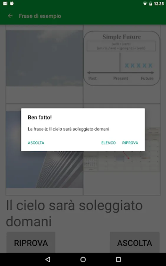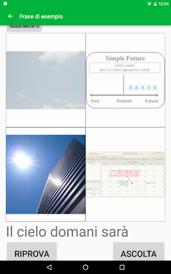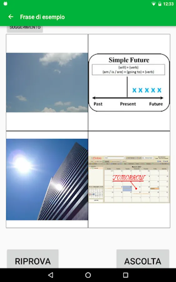The app provides the user with four images that are symbols of 4 parts of a meaningful sentence: here the person, the verb, the complement and the adverb of time. The user has access to the pre-set phrases and must select in the correct order the sequence of images to form the sentence of sens accomplished. The user can also create a custom phrase by uploading the images or the text to pronounce.