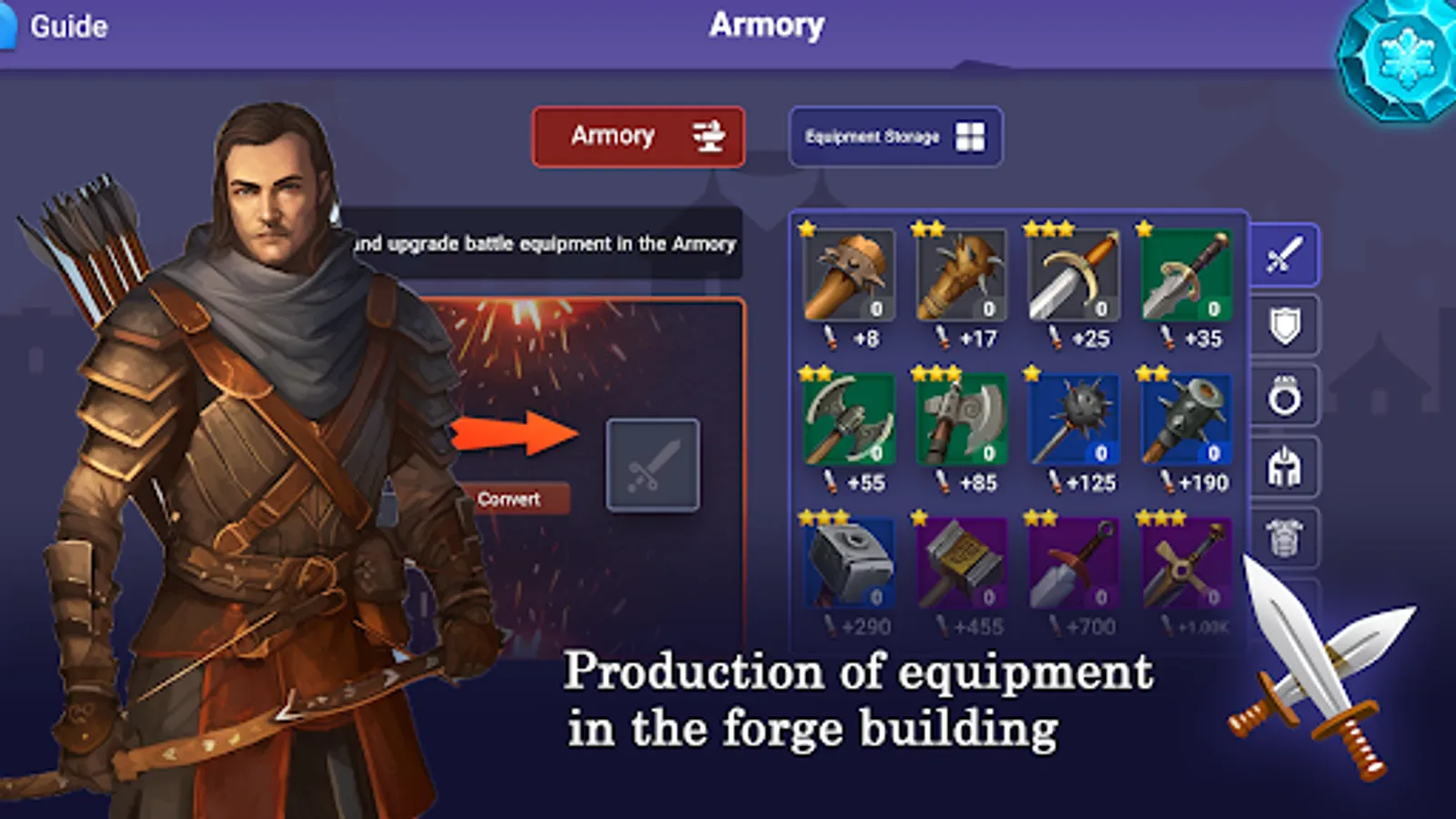 + In the blacksmith building, using special items, it is possible to produce war equipment for heroes.