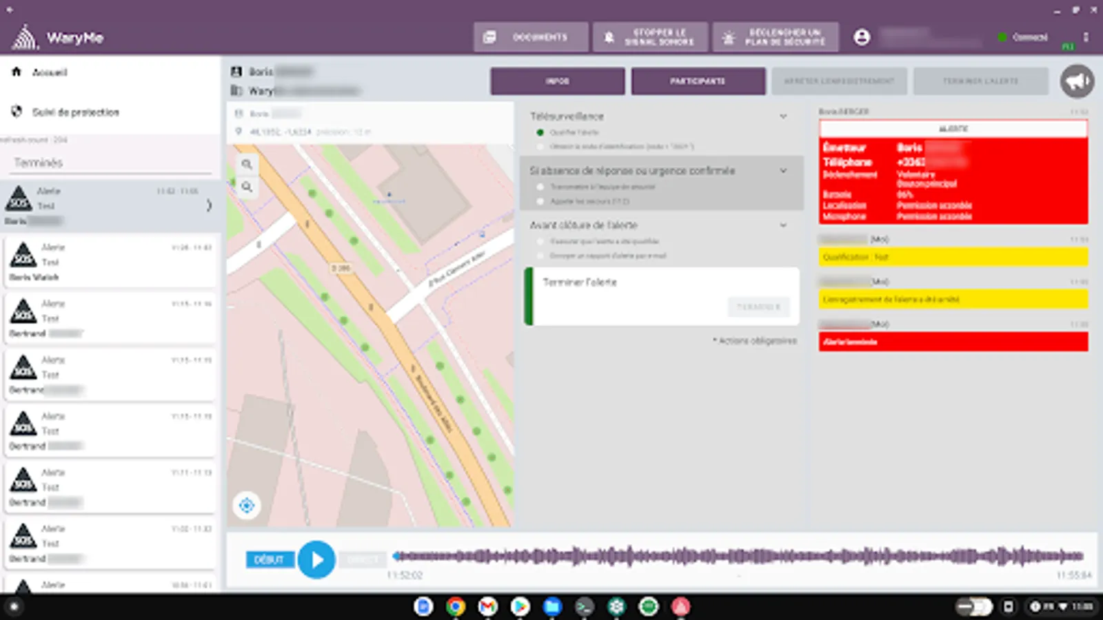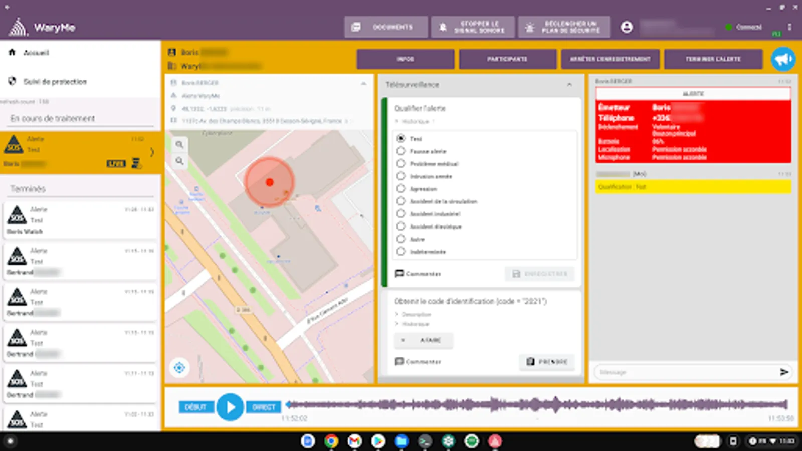 WaryMe Supervision is the tablet / PC application dedicated to teleoperators in charge of centralized event management (distress alert and crisis plans). It is intended for WaryMe customers equipped with a centralized security PC and Telesurveilleurs partners, as part of a partnership for receiving and processing 24/7 security events for certain customers.