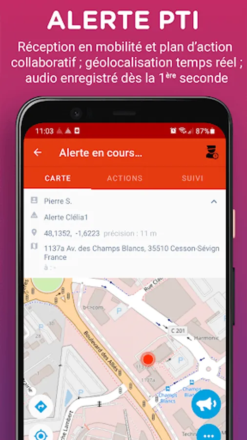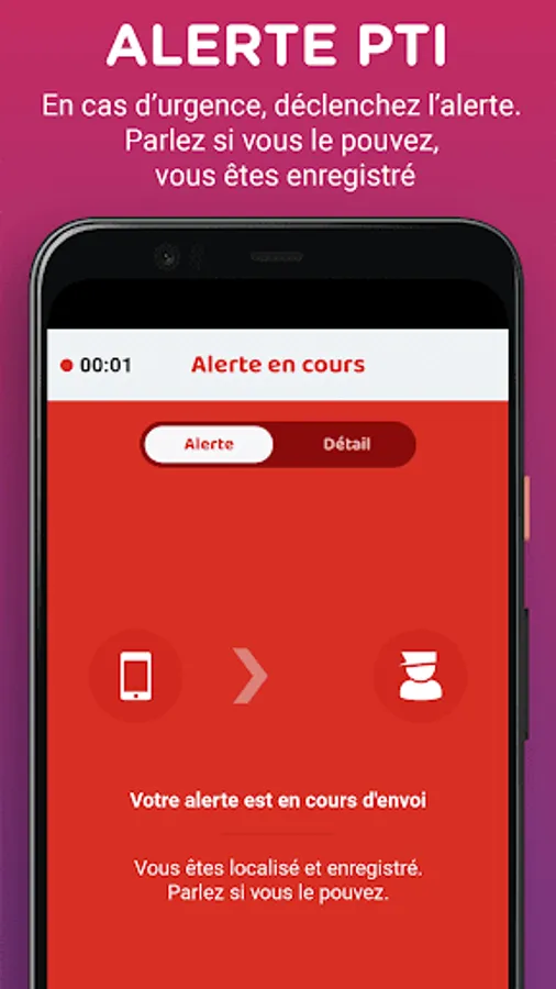 Warning: In case of threat or accident, discreetly trigger the alert. Talk if you can, you are registered. The security team is notified and qualifies the event.