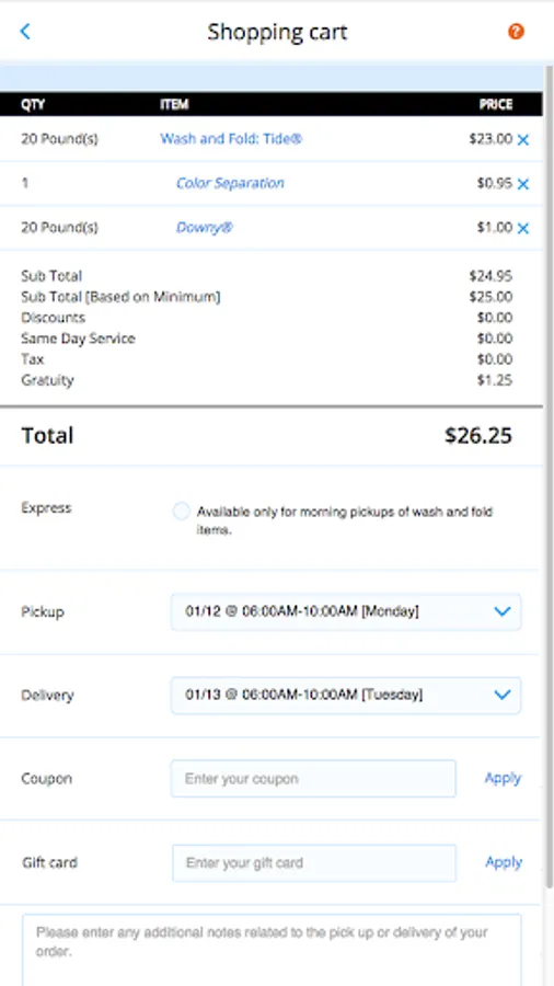 1. Start by scheduling a pick up using our Android app. Simply add items to your shopping cart, add any special instructions, select a pick-up and delivery window, and that's it! You can list special care instructions for each and every item you add to your shopping cart should you desire. Have delicate items that you don't want dried? No problem! Do you want fabric softener on your towels only? No problem! Whatever you want, just let us know, we've got you covered.
