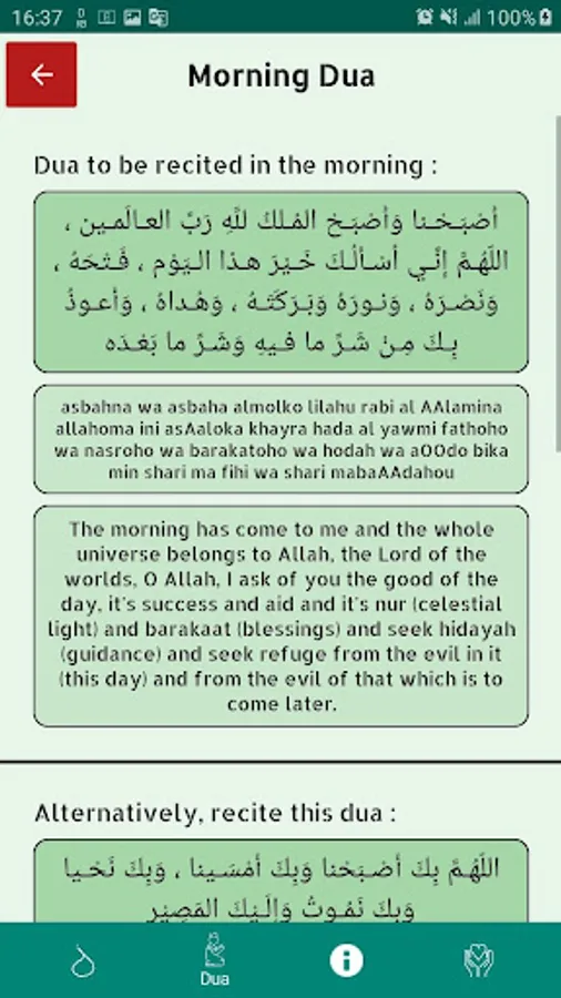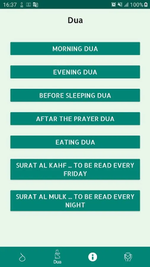 The app contains also different types of Dua such as morning Dua, evening Dua, before sleeping Dua, after the prayer Dua and even surat Al Kahf every Friday, and Surat Al Mulk every night.