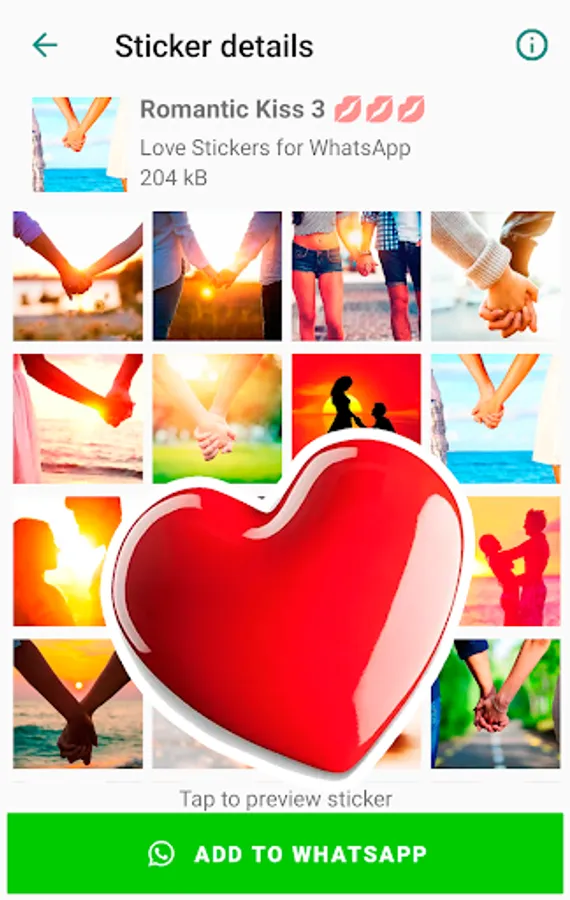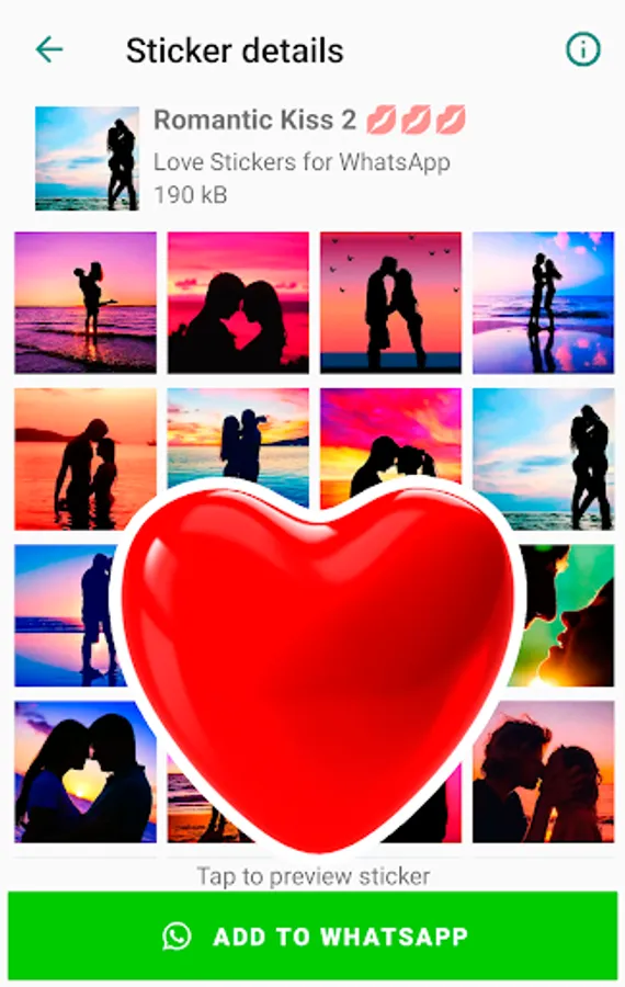 Includes new sticker packs: “I love you”, “Hot kiss”, “Romantic couple”, “Love story”, “Sexy kissing”, “Broken heart” and other love emojis for WhatsApp.