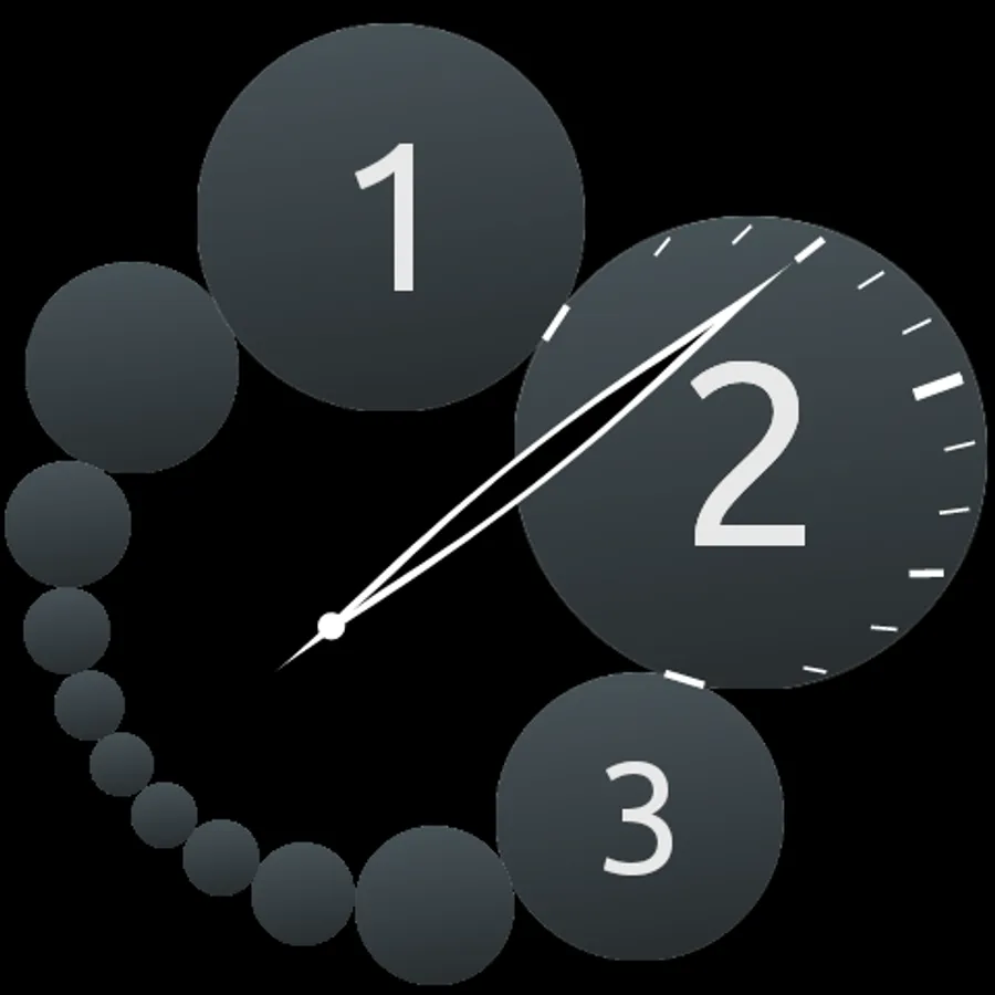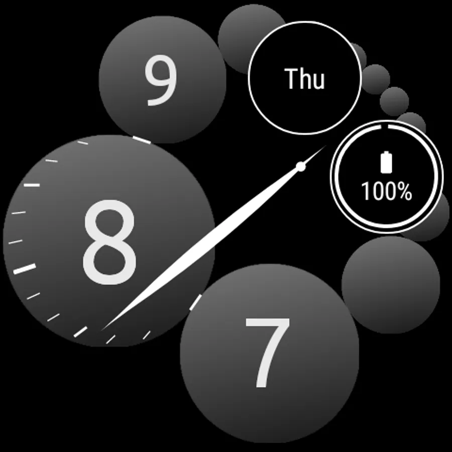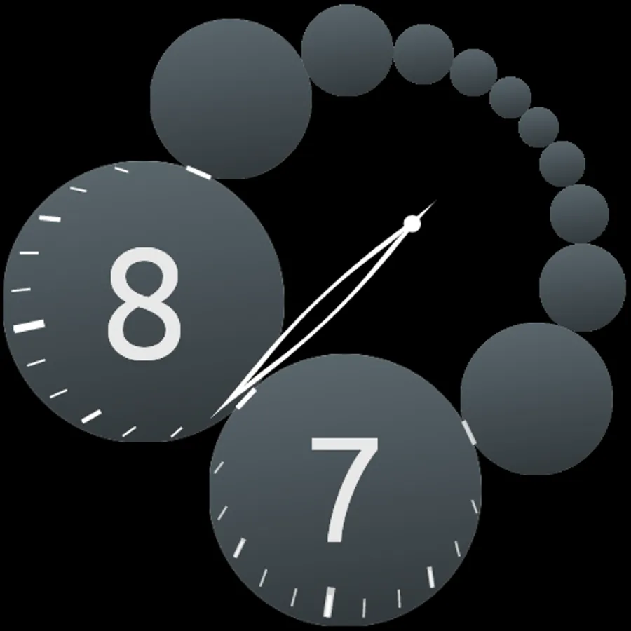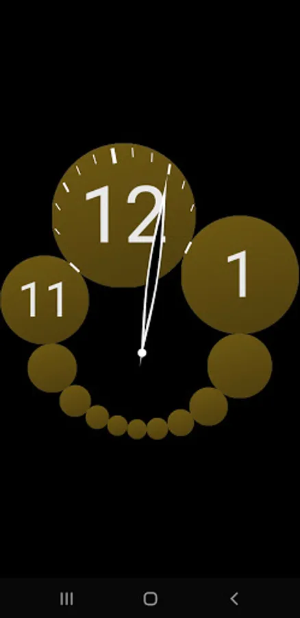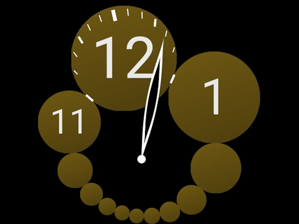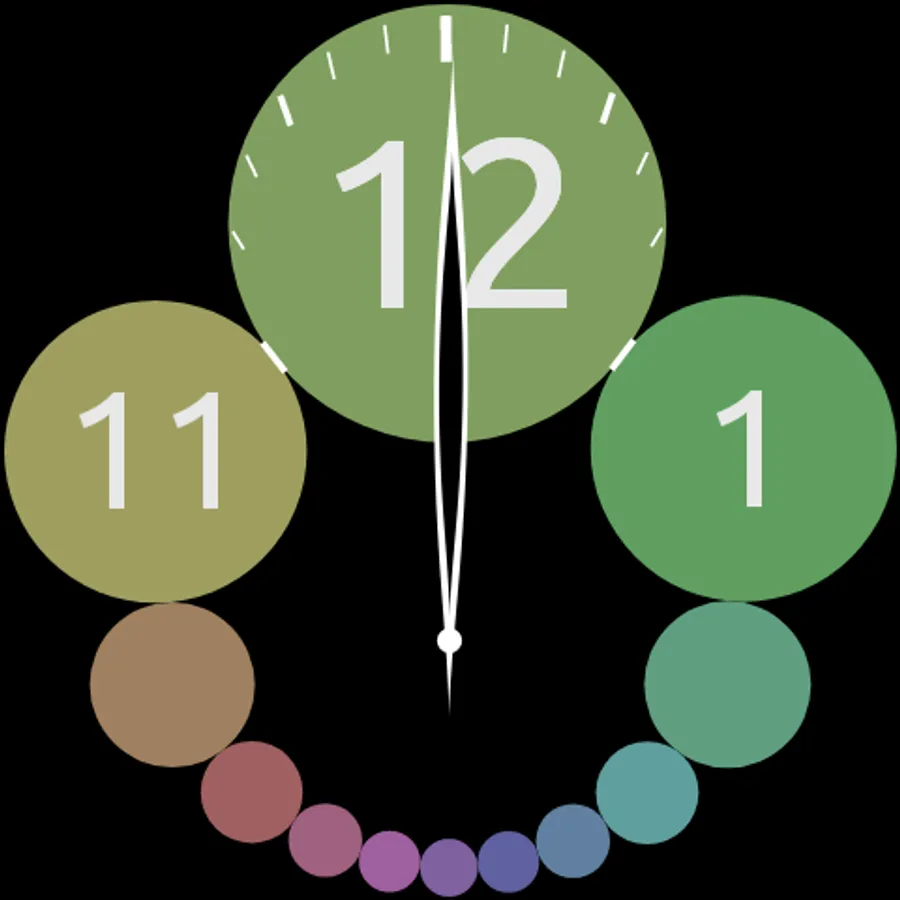 Each of the twelve hours is centered in its own disk that changes in a meaningful way. As the single hand rotates, the future hours approach and grow, while the past ones shrink and recede. All the disks change simultaneously to direct your attention to the current hour.