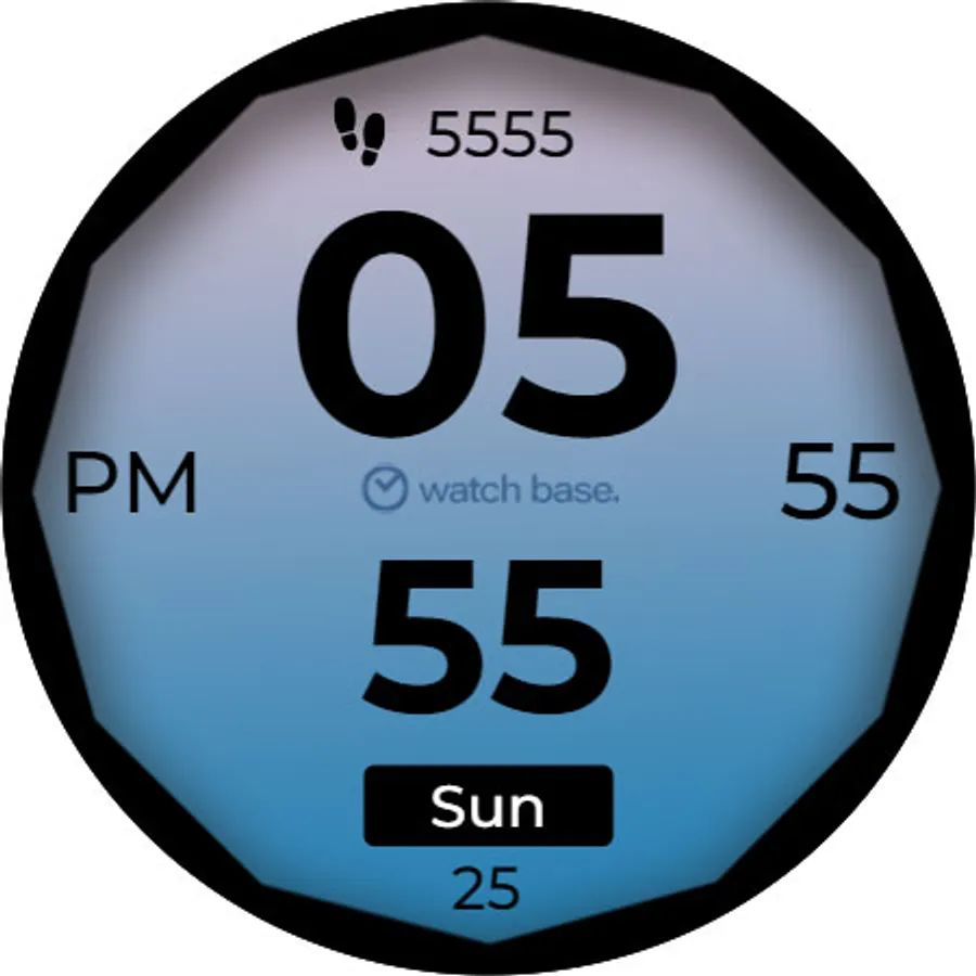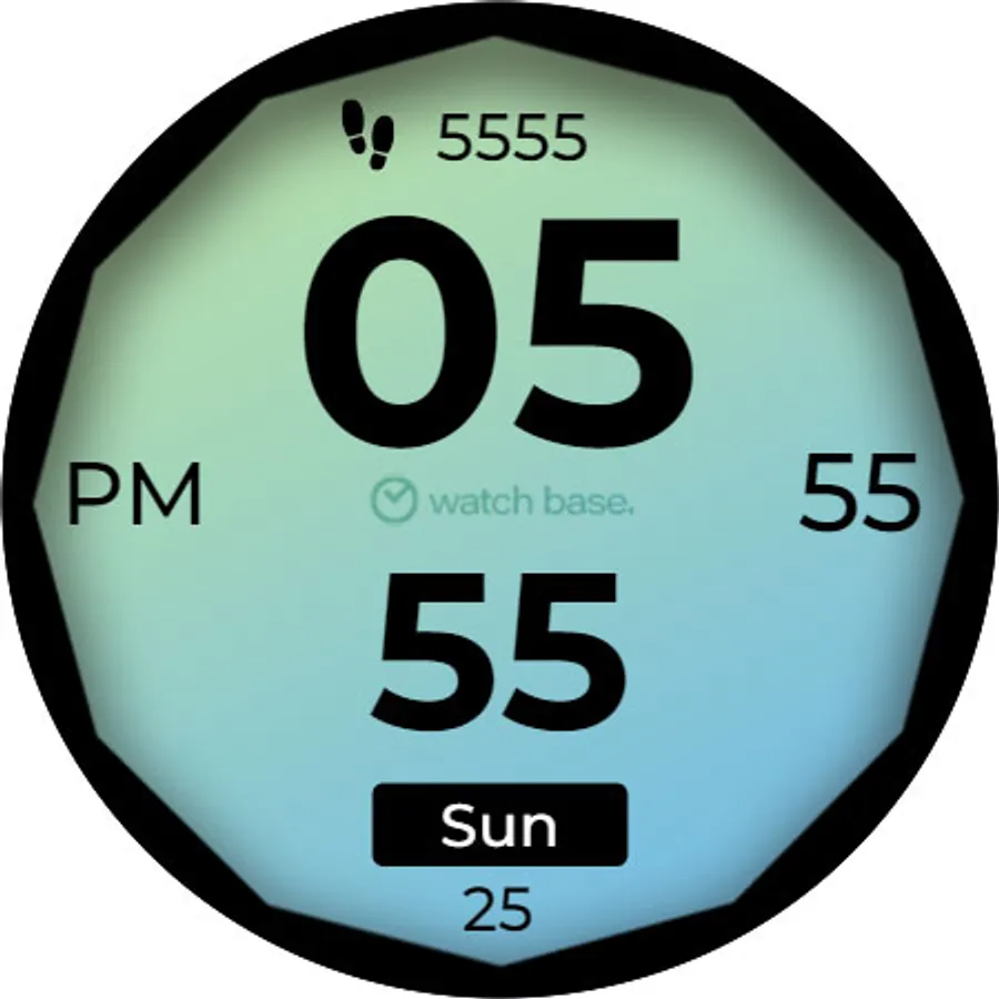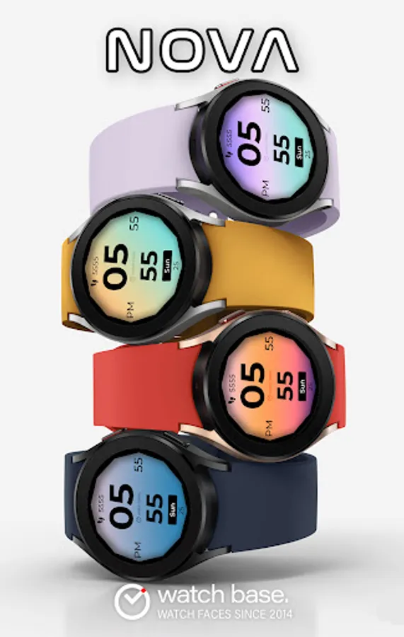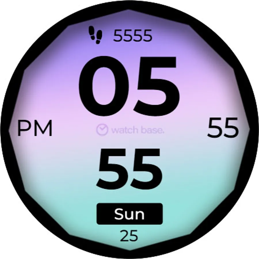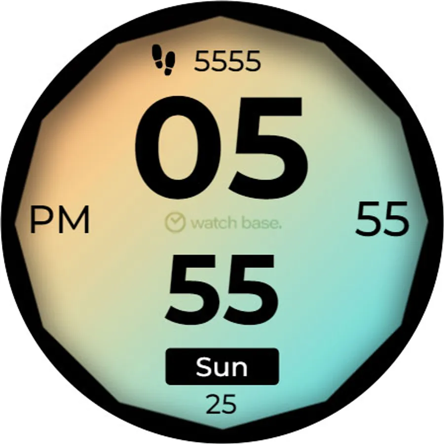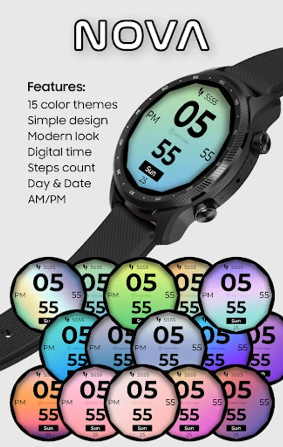 A modern watch face with minimalistic design and essential information coming up in 15 cool color themes.