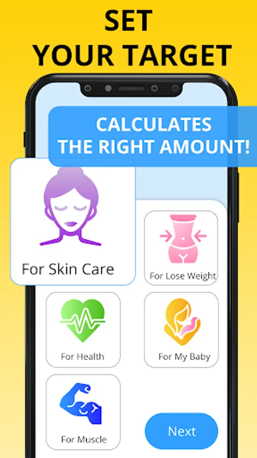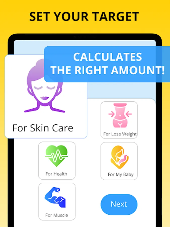 5. What is your purpose of downloading the hydration app? Want a drink water reminder to lose weight, skin hydration, health or build muscle? For these purposes, we have prepared tutorial tips for you, taking into account your personal and medical information.