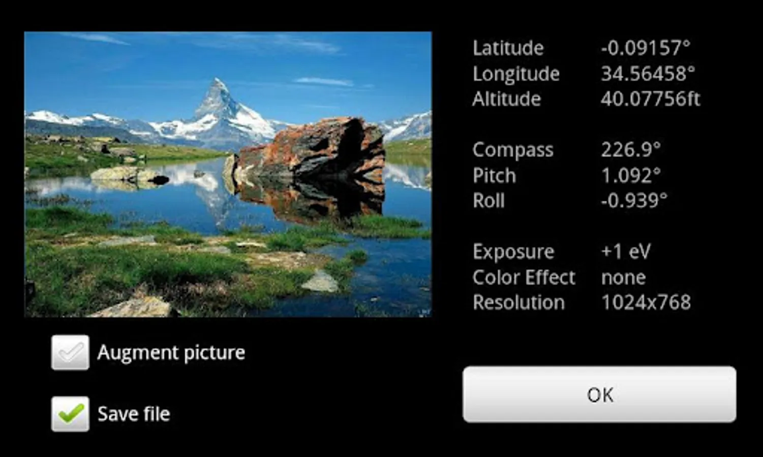 * Geo-Pictures: photos that have an extra layer of geographical data such as GPS position, compass orientation, pitch, roll, altitude, etc. This data is added into the EXIF metadata and can selectively be drawn on images as an overlay. You can see all you pictures on Google Maps or on Google Earth on your personal computer with the export feature. You can share those albums with anyone who can run Google Earth.