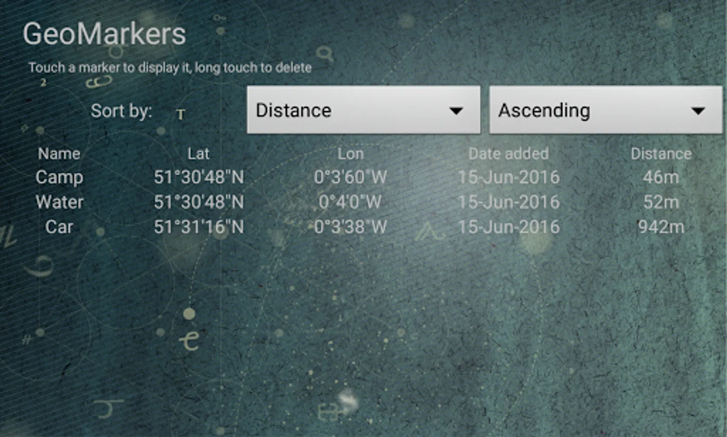 * Geo-Caching: prepare a list of key places in an area and view them with your camera on augmented reality: name, distance. You will not require a data connection offline so it can be used when hiking abroad, when visiting another city... This will help you make sure you are going in the right direction and give you remaining distance. You can also add markers during your hike with the "Add here" option, for example to flag the base camp, a water source, or anything interesting you find on your way.
