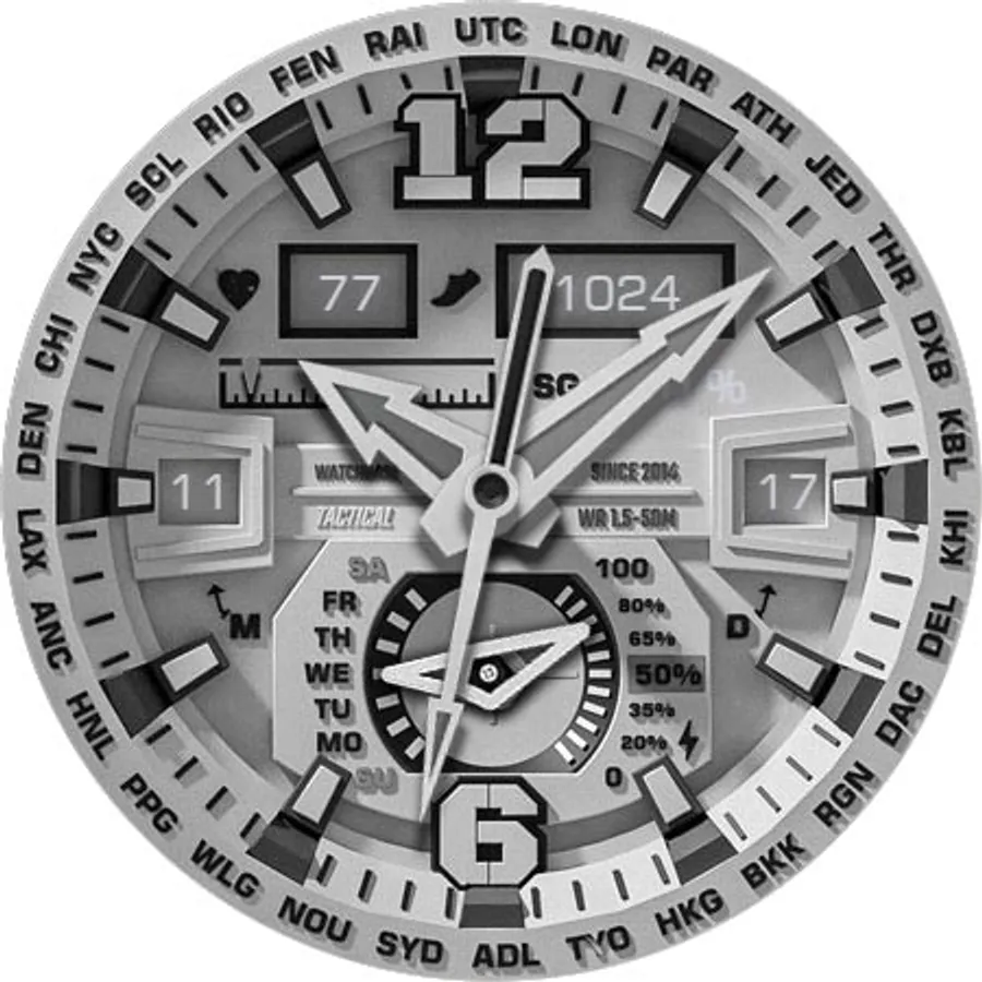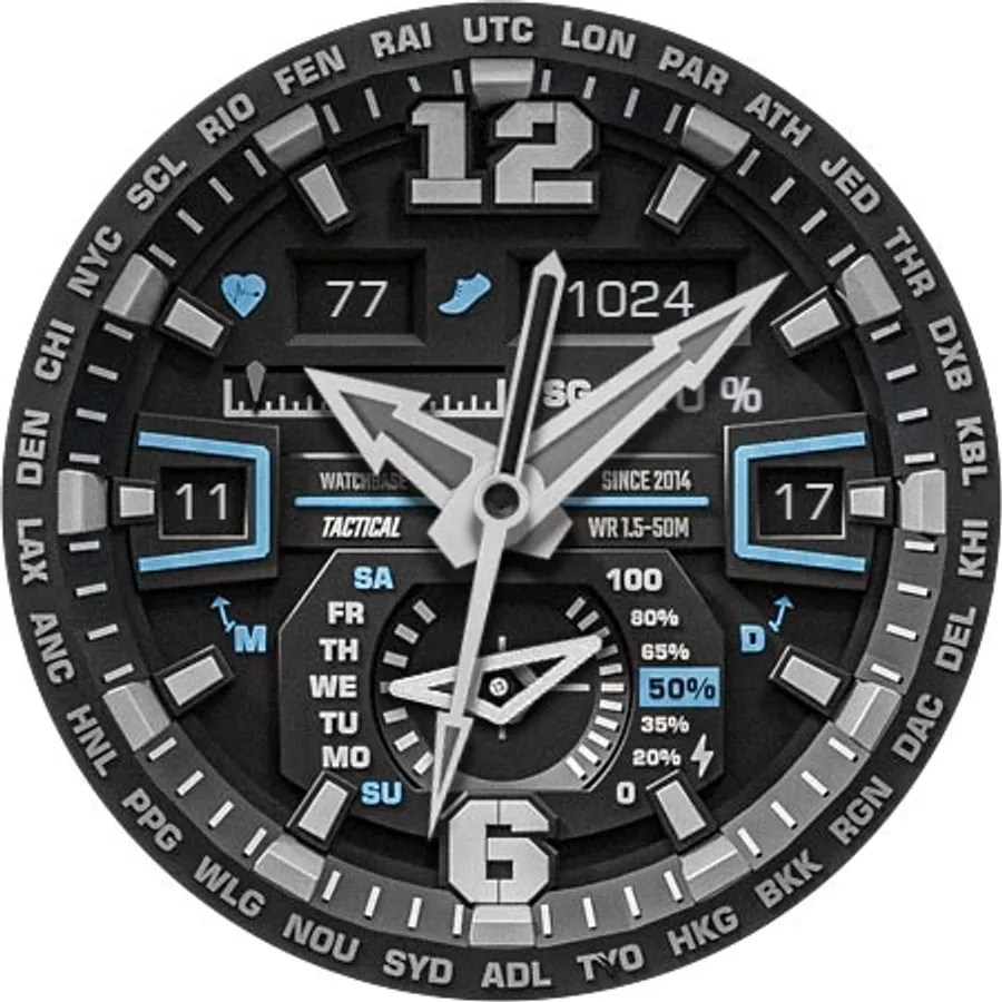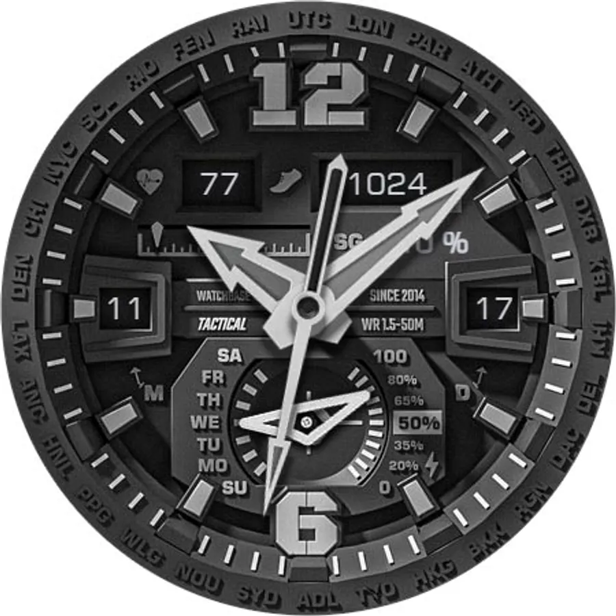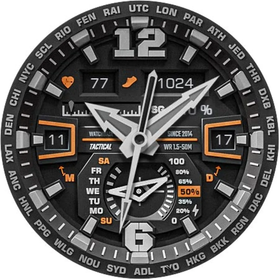 Crisp and clear to read tactical watch face for Wear OS with 10 color themes.