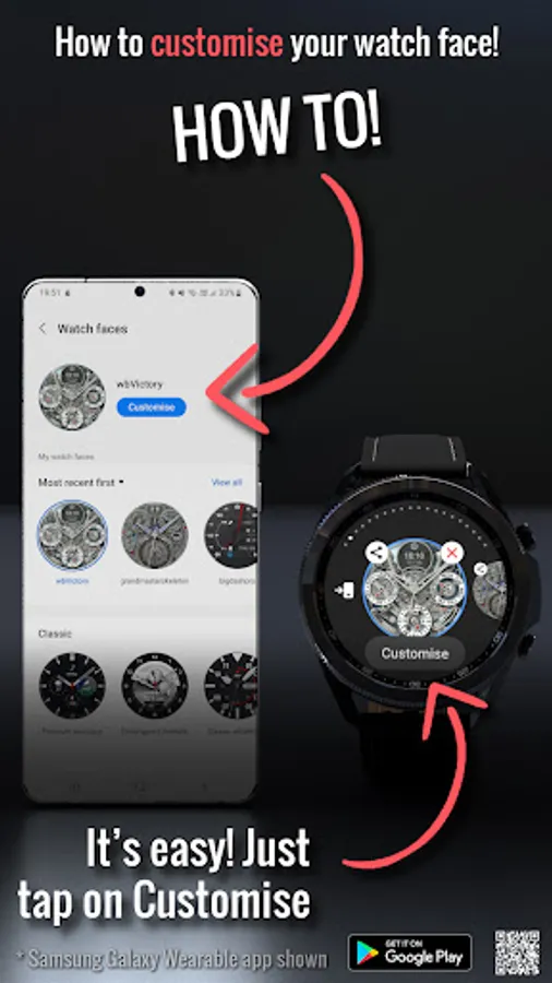 * Samsung watch devices use Galaxy Wearable App for customisations, other Wear OS watches use Wear OS app.
