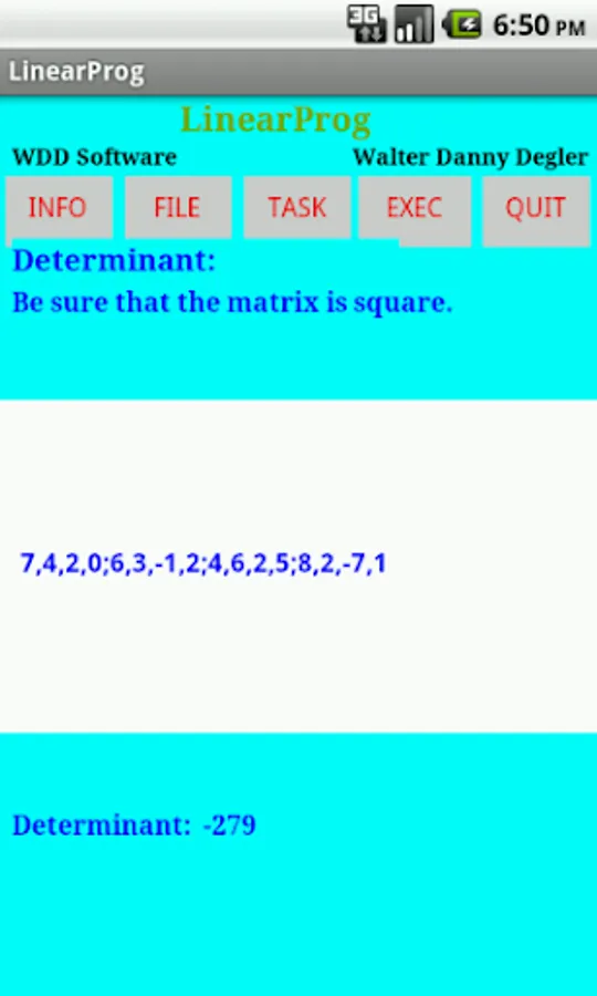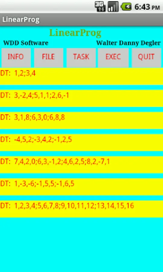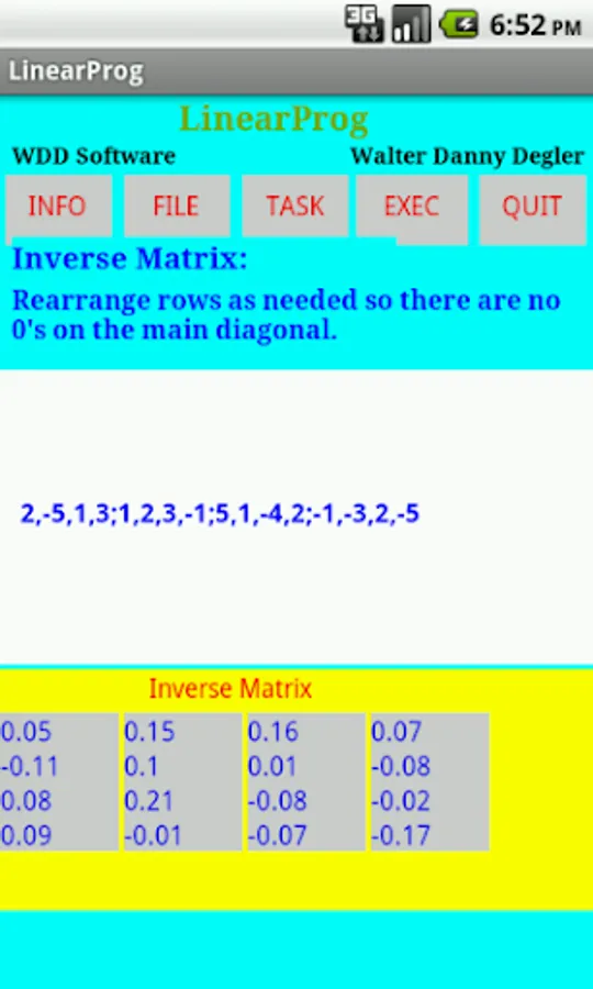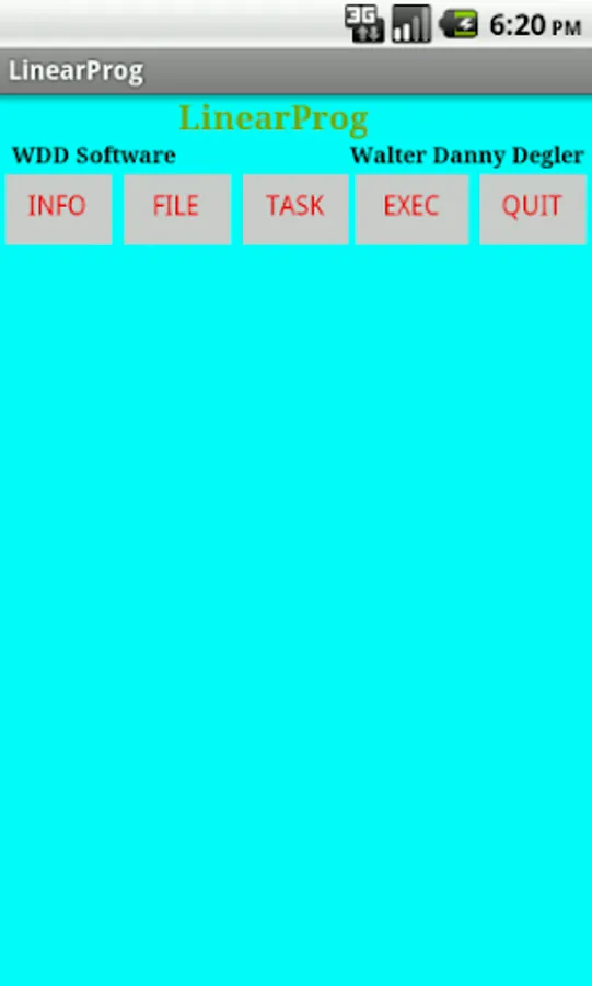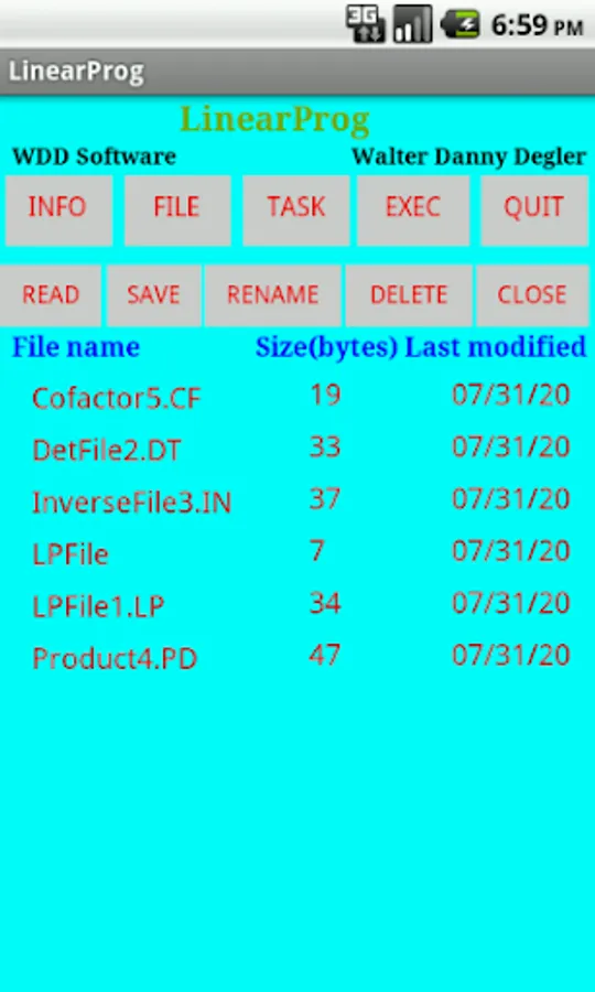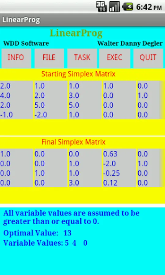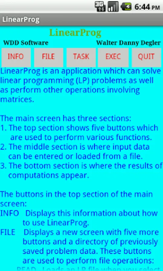 'LinearProg' is an app for solving linear programming problems. It can also compute determinants, inverses of matrices, solve systems of linear equations, compute products of matrices and cofactor matrices. Several samples of each of these tasks can be selected for viewing and solving. Problems input as well as samples may be saved as files, loaded, renamed, deleted and viewed. 'LinearProg' also provides an 'INFO' button for displaying the user manual.