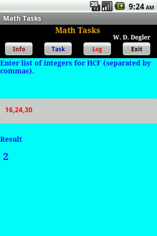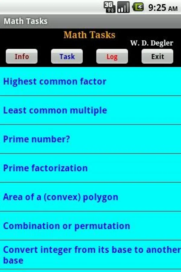Math tasks is an application which can perform various mathematical calculations not conveniently done by calculators if at all. It can compute the highest common factor of a list of integers. least common multiple (lowest common divisor) of a list of integers, whether an integer is prime, prime factorization, area of a (convex) polygon, combination and permutation counts, conversion between number bases, area and circumference of a circle/ellipse, distance between two points in a plane or in space, linear regression formulae, and factorial of an integer. More may be added by popular request.