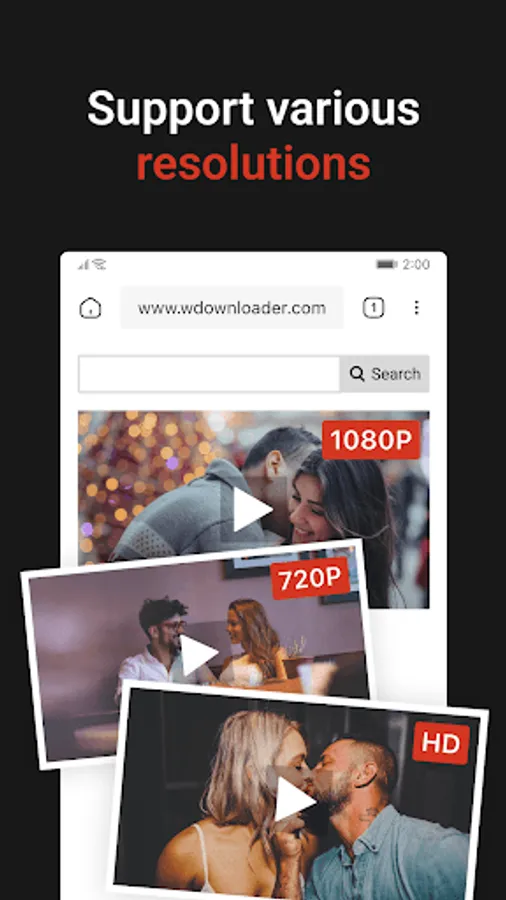 WDownloader allows you to download videos in various resolutions like 480p, 720p, 1080p, and HD! You can download and save all HD videos from the internet with just one tap. The video downloader provides you with an excellent watching experience. Download it and you won't regret it!