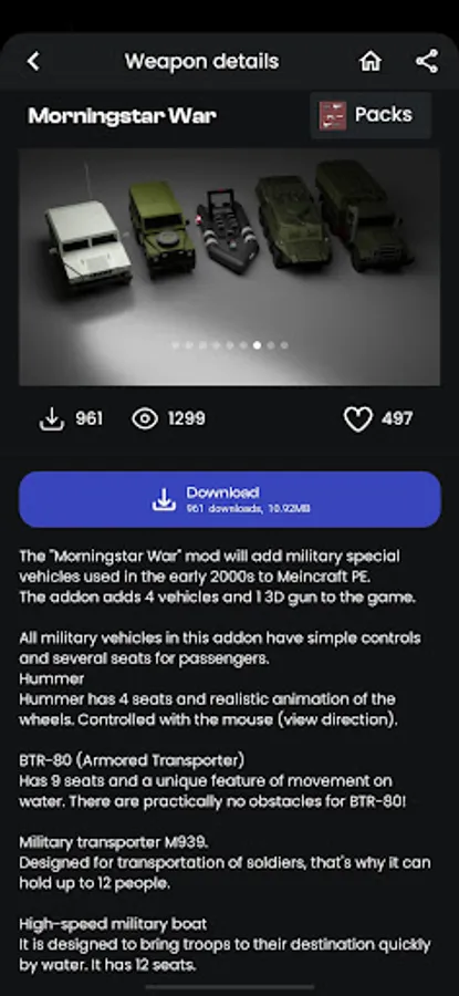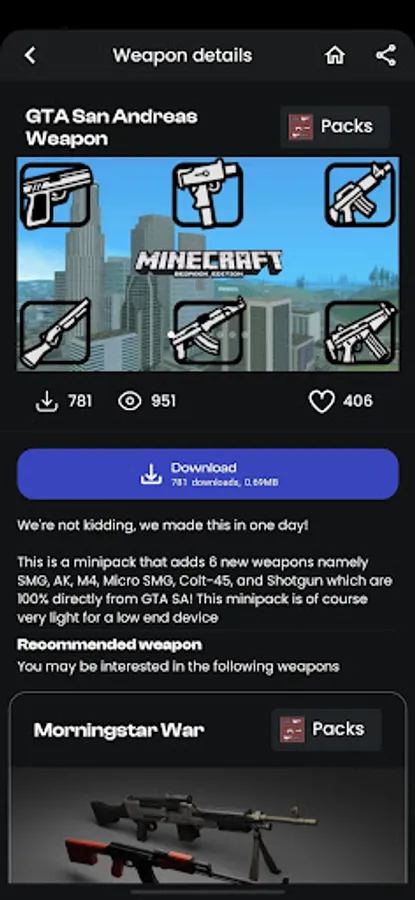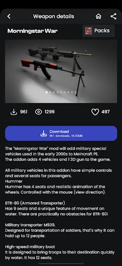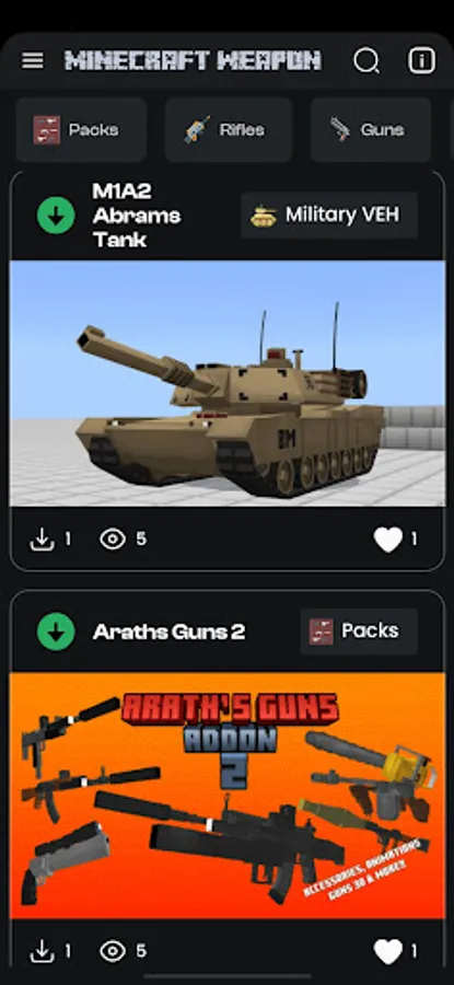 One of the main features of the application is the ease and clarity of the interface. You can quickly find the desired gun mod Minecraft and just as quickly download and install it in the Minecraft game.