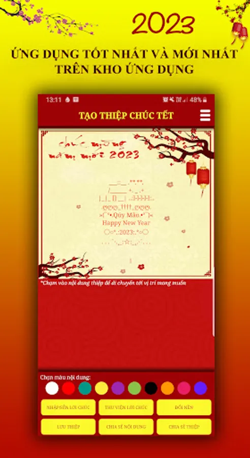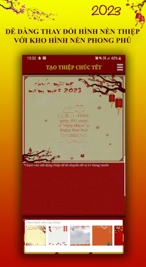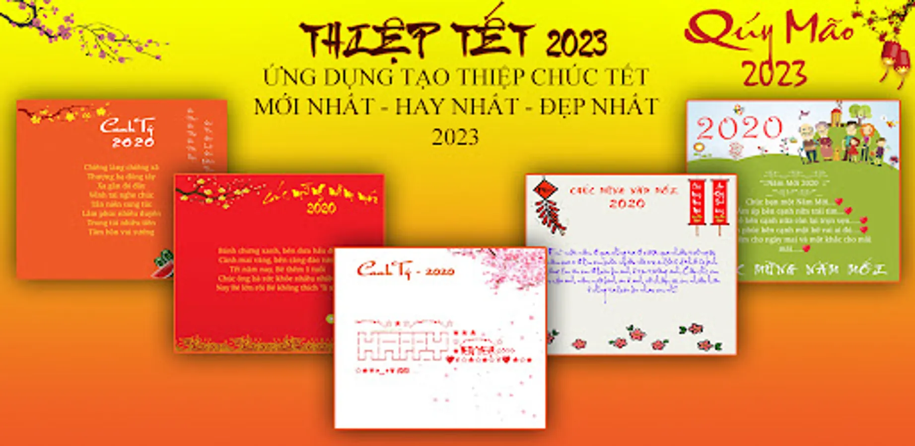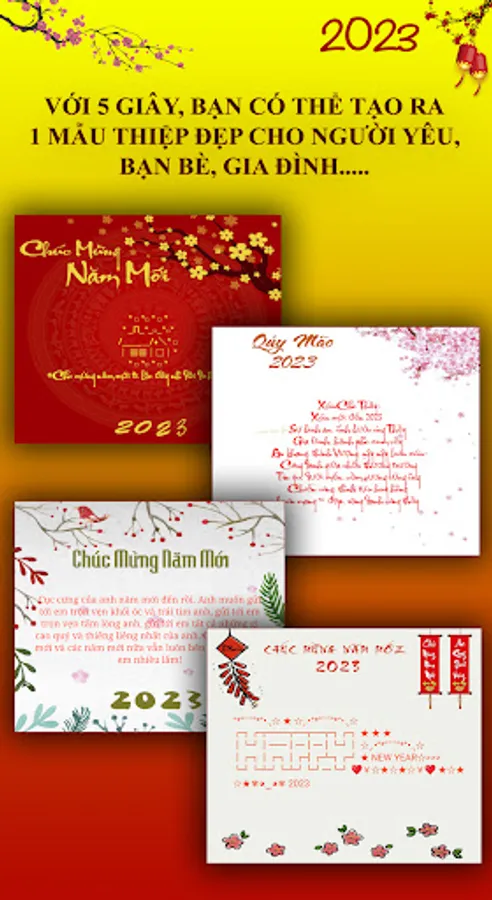 ⚡ The application synthesizes dozens of beautiful New Year 2023 card templates with New Year motifs of Vietnamese traditional Tet.