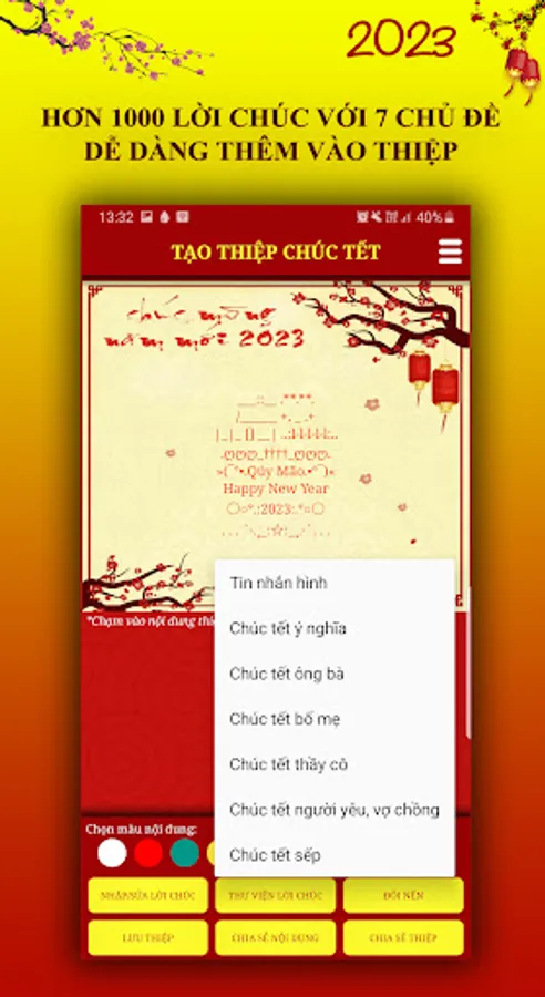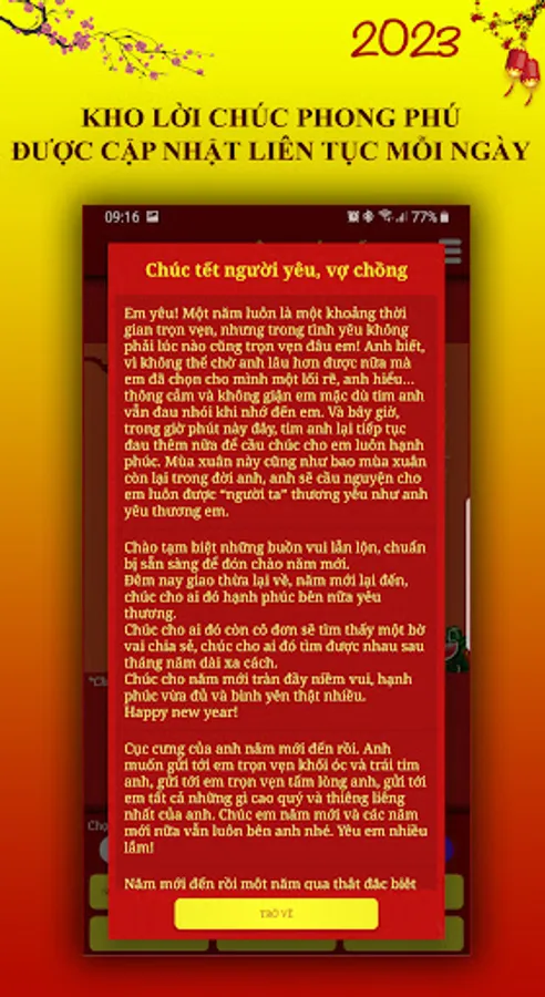 ⚡ The application synthesizes hundreds of wishes for Tet 2023 - New Year of the Rabbit, divided into suitable groups and easy to choose: