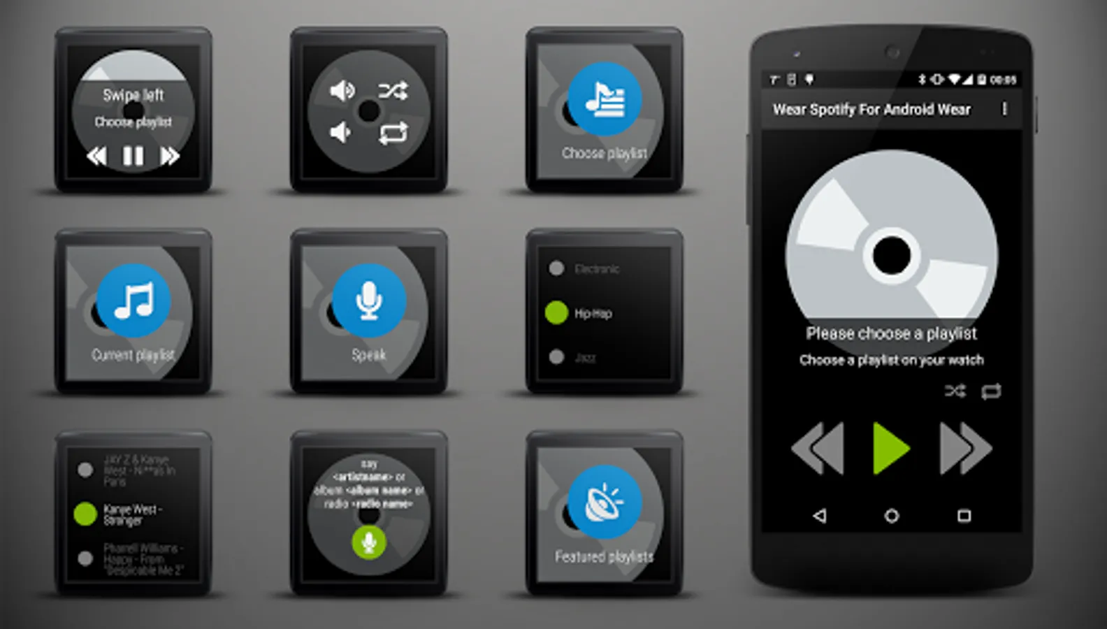 Spotify is now available for your Android Wear smartwatch. With Wear Spotify you can easily browse your playlists and select your favorite songs without using the mobile phone. In addition, you can regulate the volume and control your media player on the mobile phone remotely. The current artist, song title and album art is shown as notification card on watch. More features will be added soon. Please write us an email first before leaving a bad review. We will resolve the problem quickly. Thank you.