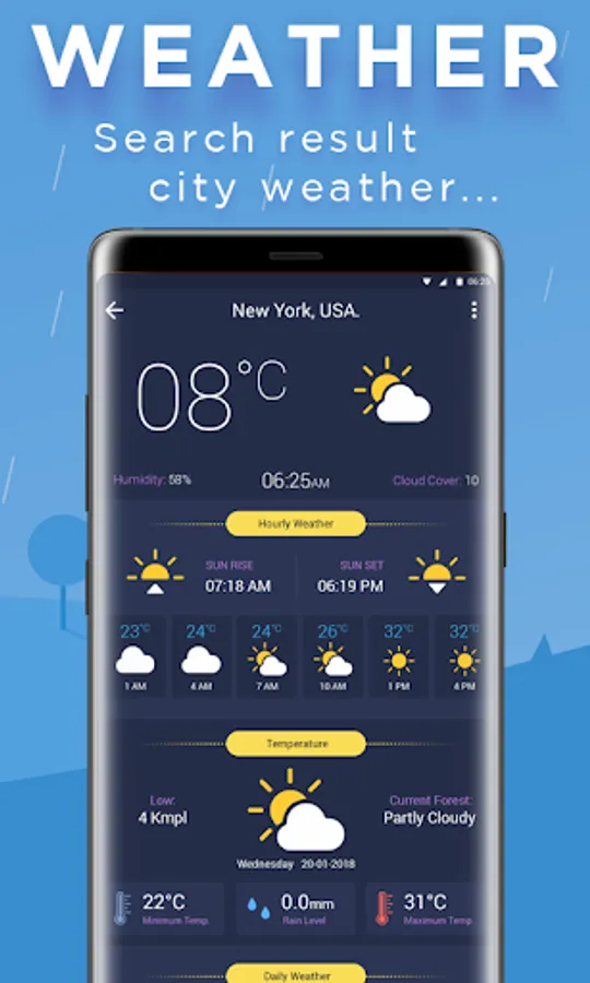 Detailed Weather Update:- This daily weather app can display current temperature, daily and hourly forecasts. It also shows Sunrise Time and Sunset time along with humidity, wind speed, air pressure and much more.