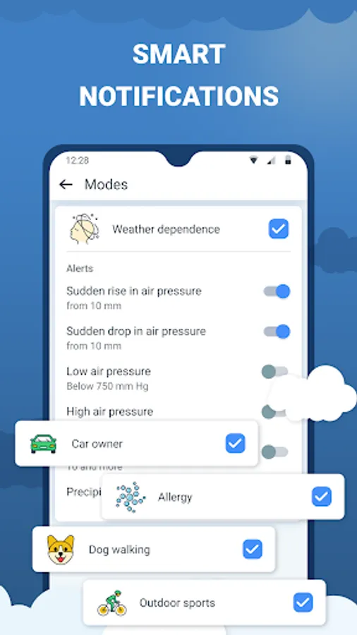 Are you weather dependent? Do you suffer from allergies? Or maybe you do outdoor sports or walk your dog? Or are you interested in the stars and a clear night sky is important to you? Or maybe you are a car owner? The app will take into account all these and other factors and will notify you only about those weather conditions that are important to you.