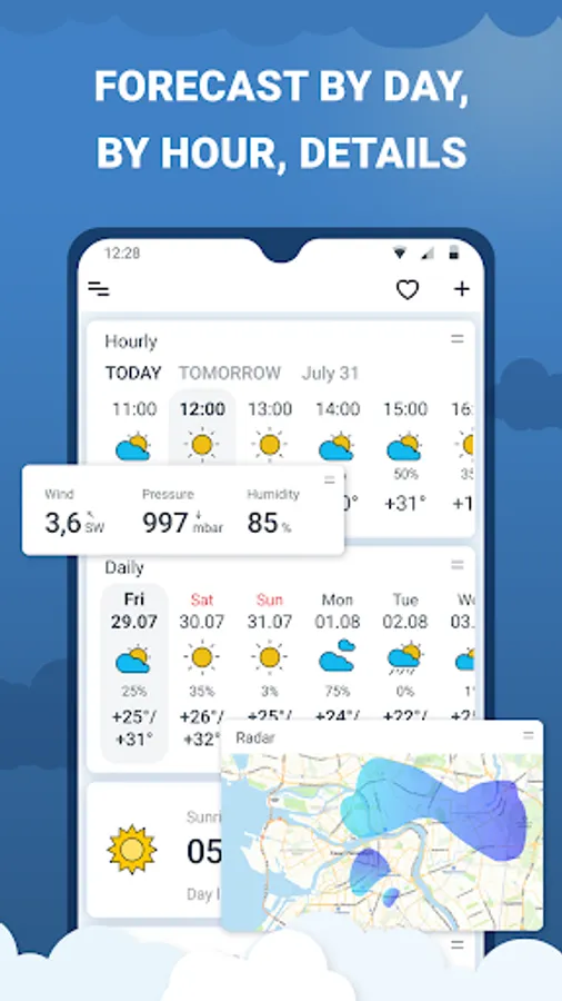Customize the screen for yourself: edit sections and swap them so that you always have only the most important data in front of your eyes: daily or hourly weather forecast, radar, wind, pressure, humidity, cloudiness, visibility, UV index, sunrise and sunset times, day length, allergens in the air and much more.
