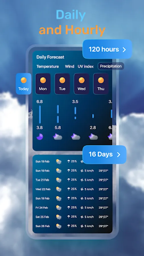 ☀️ Hourly Weather Forecast and 16 Days: Whether you're planning a spontaneous outing or a fortnight-long vacation, our app provides both hourly and extended 16-day forecasts.