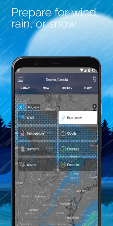 • Real-time weather maps animations with blizzard & hurricane tracker: rain, snow, clouds, wind, temperature, humidity, wave, pressure, current