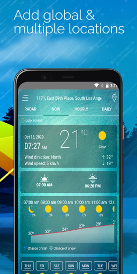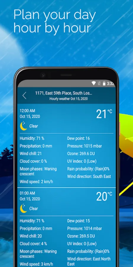 • Weather description: sunrise & sunset time, humidity, precipitation probability, visibility, etc.