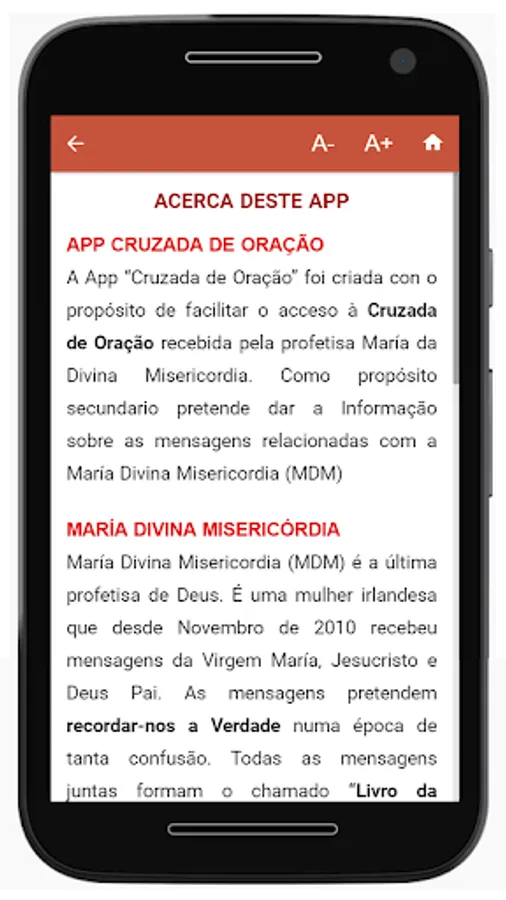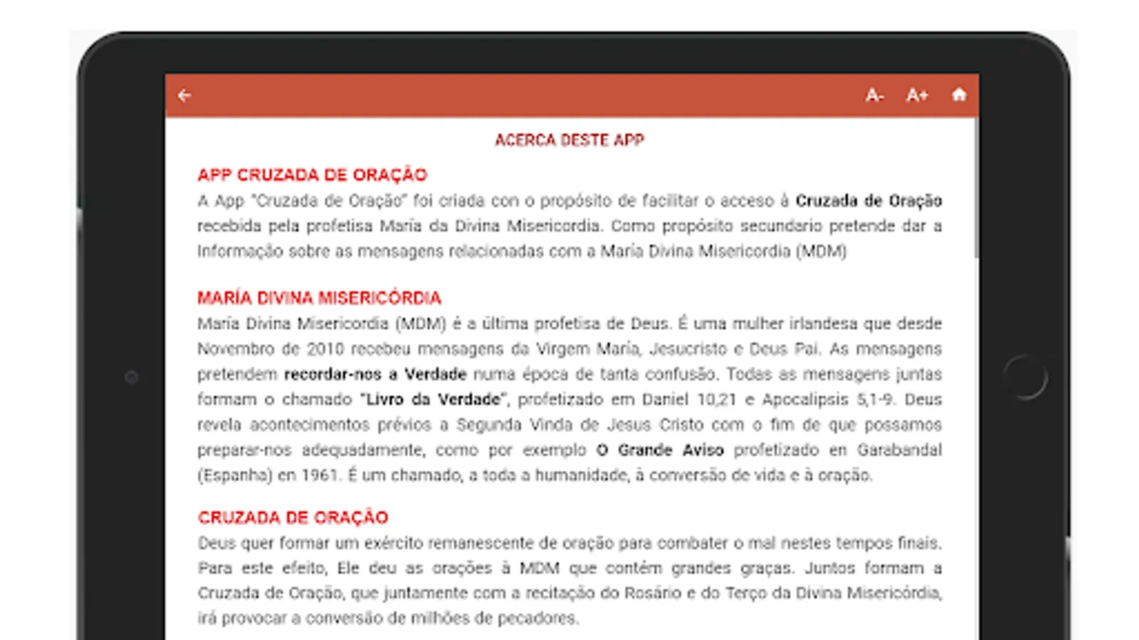 This APP contains all the prayers in Portuguese of the Prayer Crusade that God gave to his last prophetess (Mary Divine Mercy - MDM). The prayers were divided into groups and the audios were included. It also includes some excerpts from messages received in connection with these prayers.