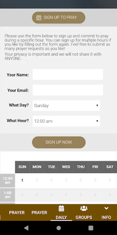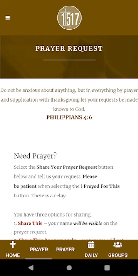 This app is for you to request prayer and pray for others. Rest assure there are people are willing to join you in prayer at your time of need (Matthew 18:19-20, 1 Timothy 2:1-2, James 5:14-15). Prayer is not a sign of weakness but of confidence and assurance that you trust God in His will for your life.