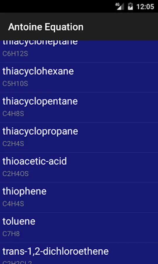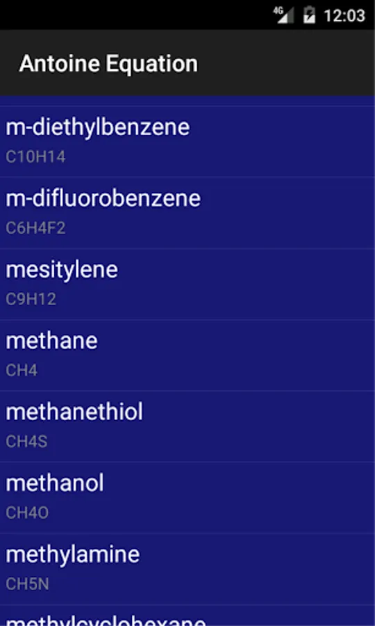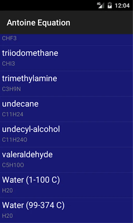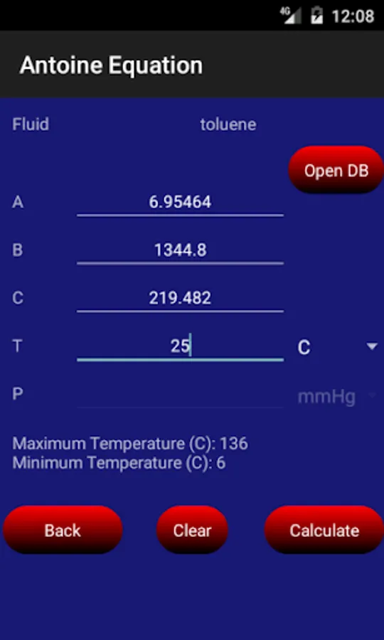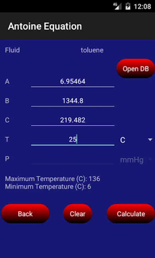 The equation constants A, B and C can be entered or obtained from the internally built in database which contains around 700 fluids, the database is also contains minimum and maximum temperatures for calculation limits.