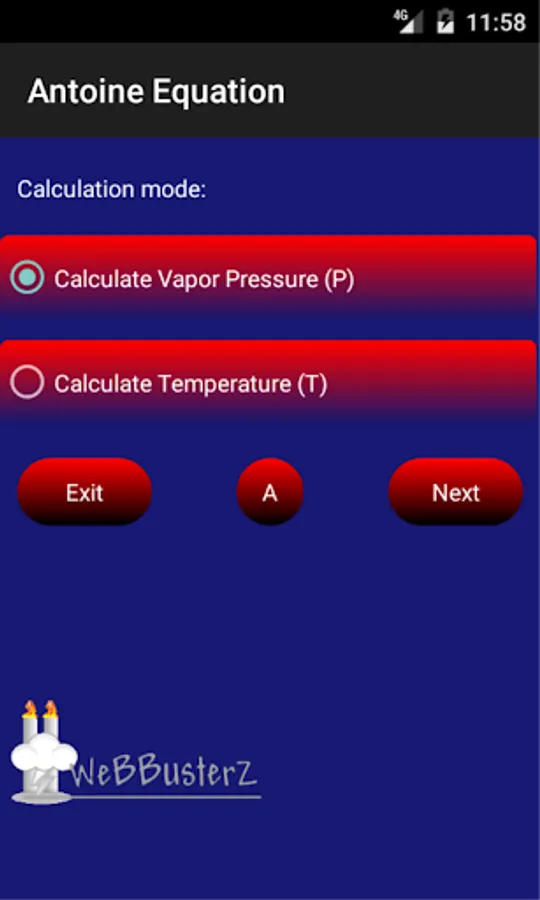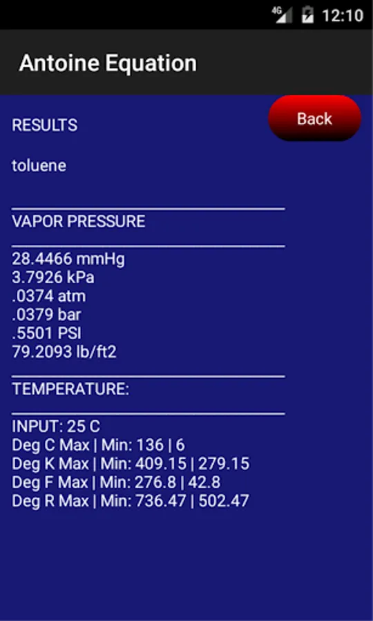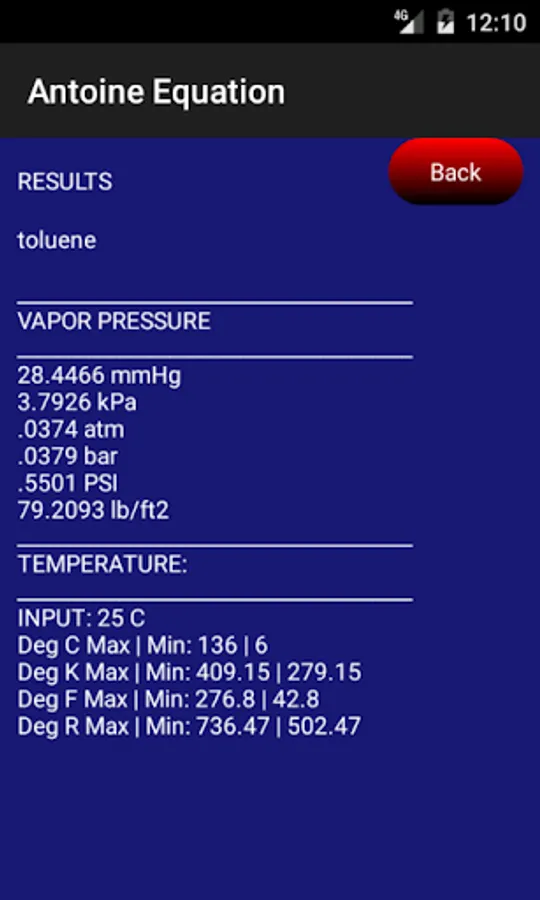 The Second allowing the calculation of temperature using the equation constants and input pressure. The pressure can be entered in mmHg, Pa, kPa, bar, PSI or lbf/ft2