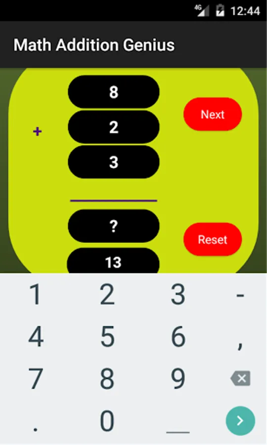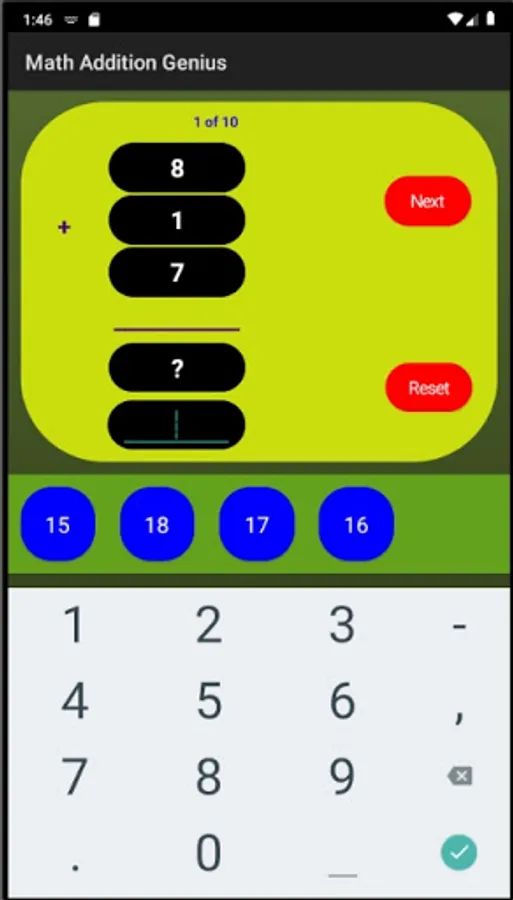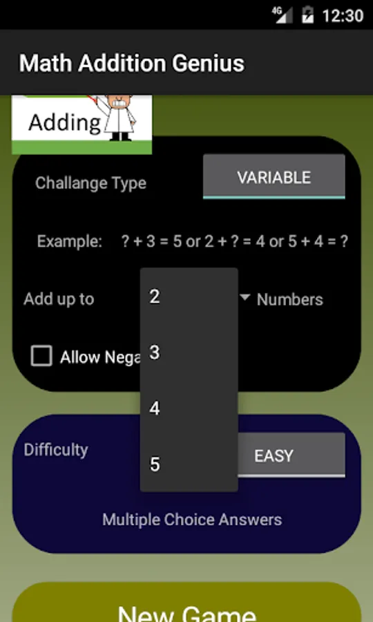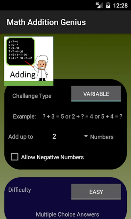 + Variable challenge - in this mode the application will select a set of number addition questions and expect the user to find the missing number to needed in the addition to sum up the total answer or vice versa.