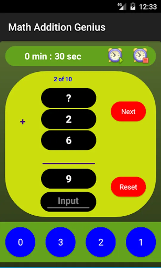 + Answer a specific number of math addition questions (The number can be set by the user in settings screen), the application will score and provide the total time taken to answer all question