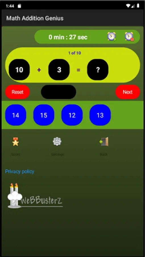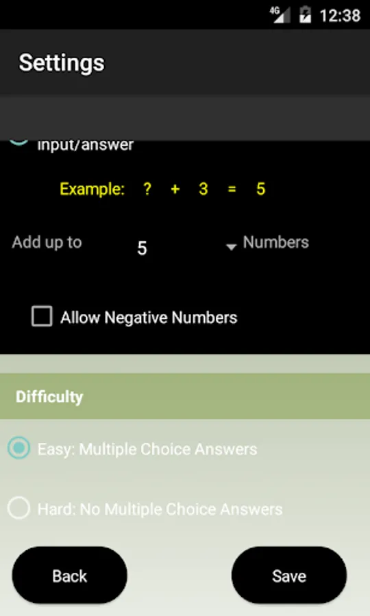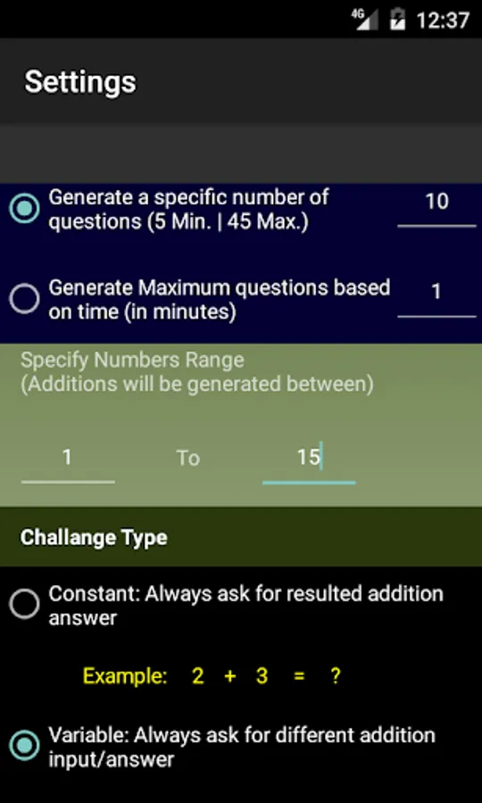 The default settings are set between 1 to 15 , this means that all the math number additions are going to be generated with numbers between 1 to 15. All settings can be changed and saved in the "Settings screen"