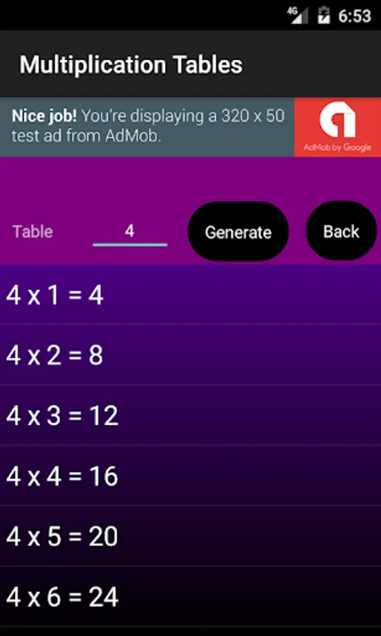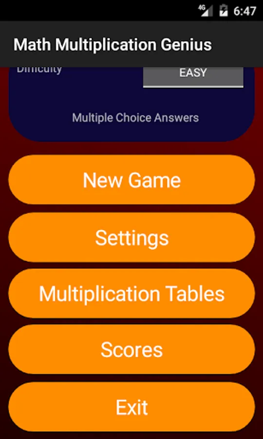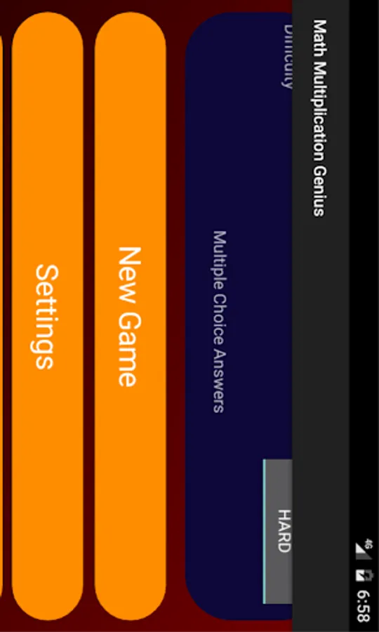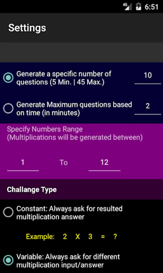 The default settings are set between 1 to 12 , this means that all the math multiplications are going to be generated with numbers between 1 to 12. All settings can be changed and saved in the "Settings screen"