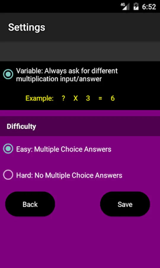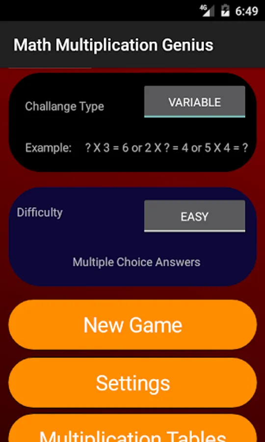 + Variable challenge - in this mode the application will select a set of math multiplication questions and expect the user to find a multiplier to get a specified answer or provide the answer to a multiplication question.