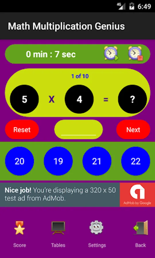 + Answer a number of math multiplication questions (The number can be set by the user in settings screen), the application will score and provide the total time taken to answer all question
