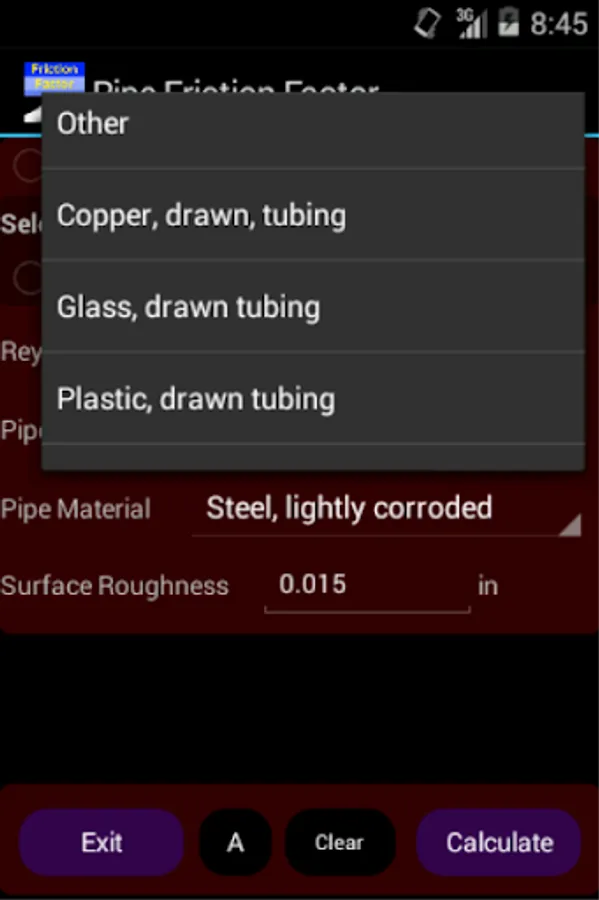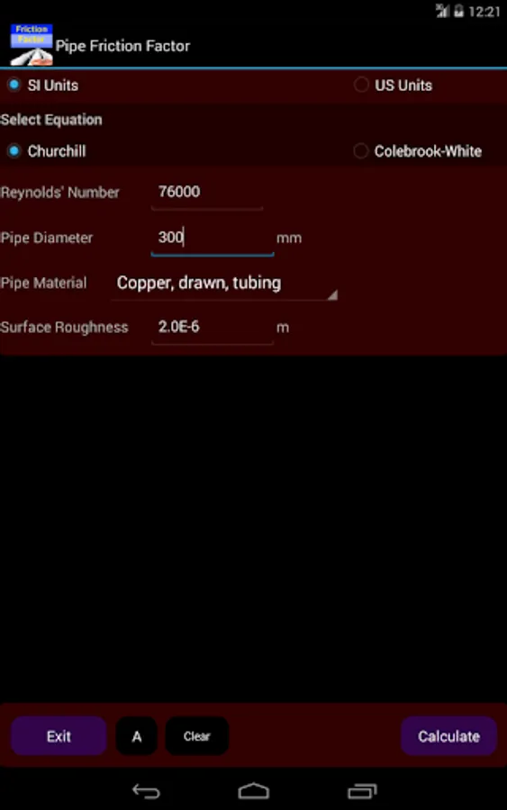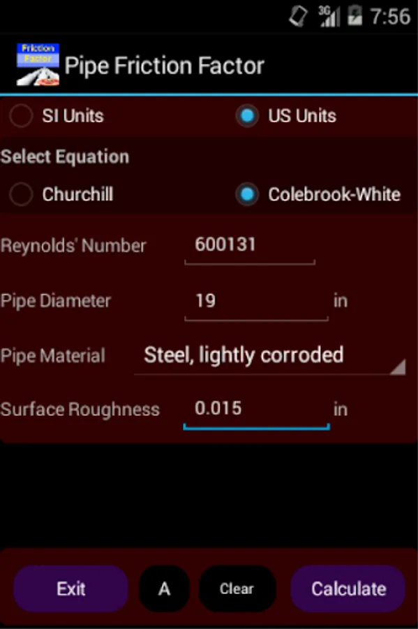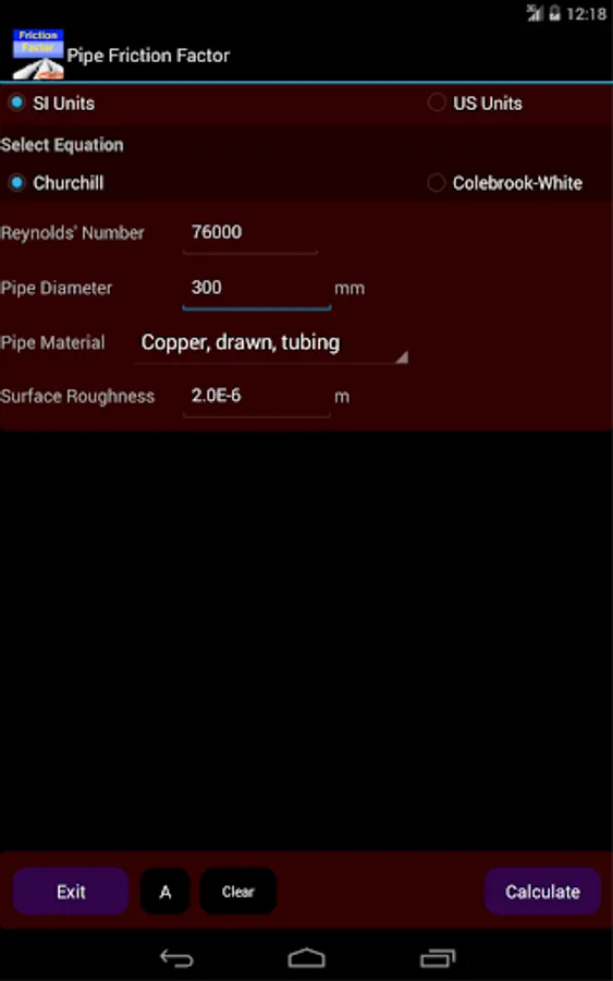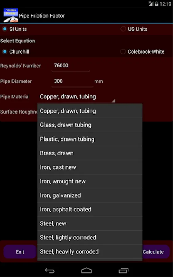 The App accepts input in two different units, SI Units and US Units. There is a small database for different pipe materials that include values for Surface Roughness taken from literature,