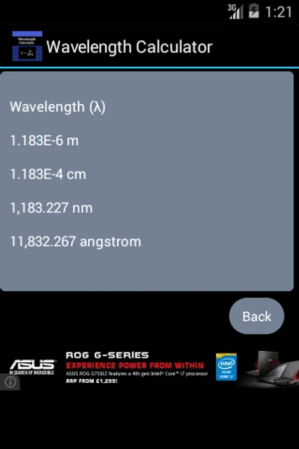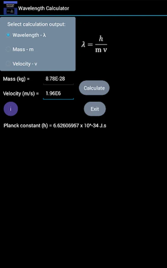 This mobile application uses de Broglie wavelength equation to calculate a particle wavelength then display the results in different units. The application can also calculate the velocity or mass based on the same equation.